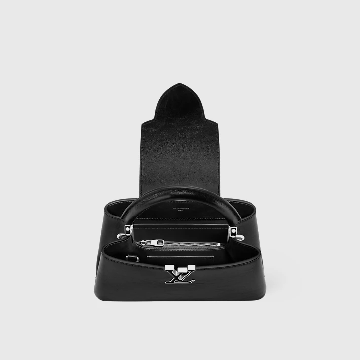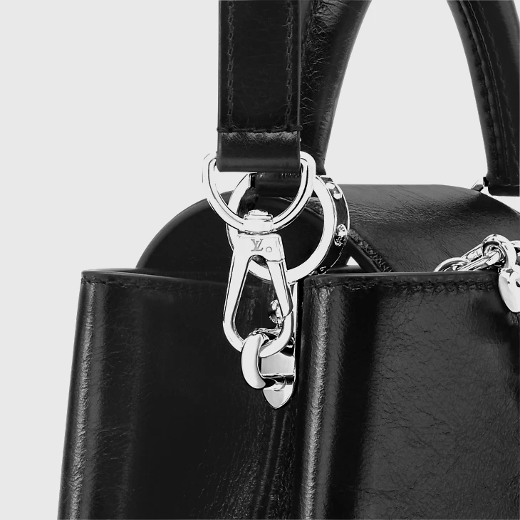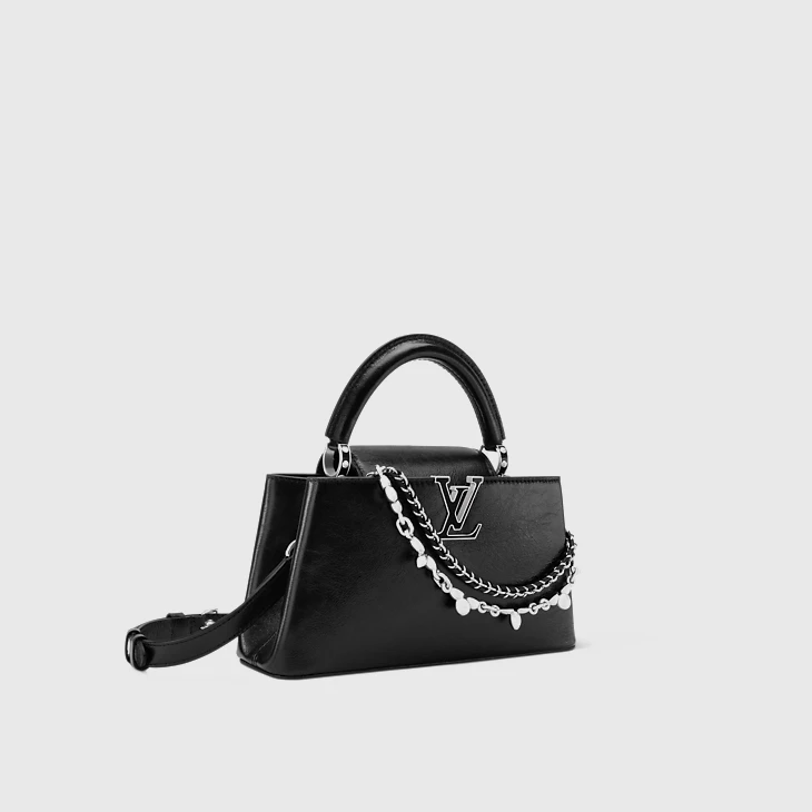 The iconic Capucines East-West BB is given an edge this season with a crinkled leather finish. It is trimmed with cowhide and elevated with silver-toned hardware, including signature LV Initials and two decorative chains, which can be removed if desired. The capacious double-carry style offers multiple organizational features inside, and can be worn multiple ways.