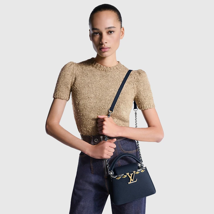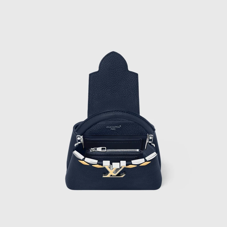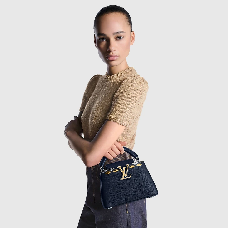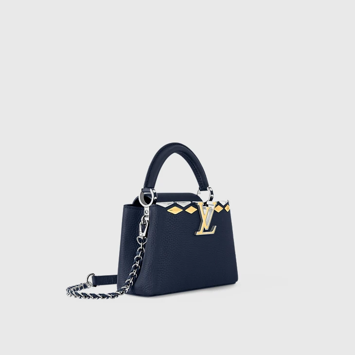 This seasonal iteration of the Capucines Mini reveals a new Malletage crown signature with striking diamond-shaped embellishments. It is crafted from Taurillon leather, offset with a mix of gold- and silver-toned hardware. The double-carry design can be styled with the flap tucked inside or outside, and opens to a compartmented interior with enough space to fit all the essentials.