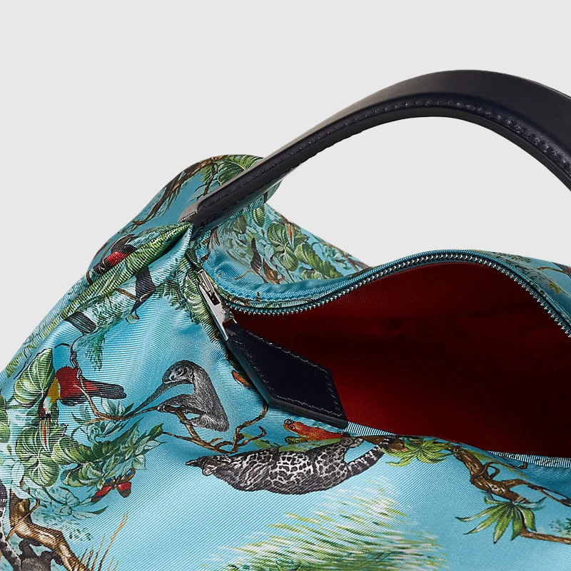 Bag in “Equateur” printed silk and Hunter cowhide with unlined interior, pull-tab and leather handle