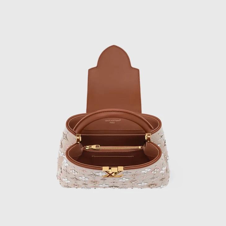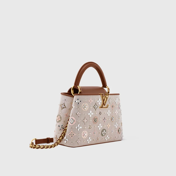 The Capucines Flower Garden collection presents this exquisite edition of the iconic BB handbag. Crafted from cotton, it is embellished with sequins that are meticulously placed to reflect the House’s signature Monogram. The elegant design is trimmed with leather and finished with gold-toned hardware to create a rich textural contrast. Attach the braided chain to wear it crossbody.