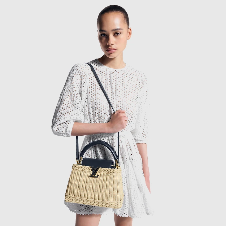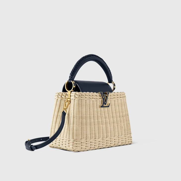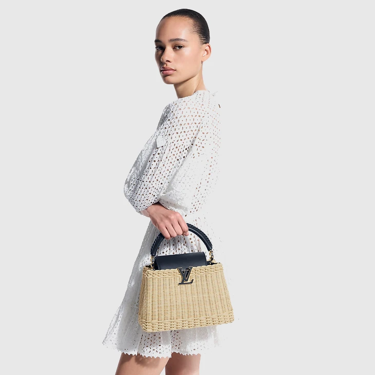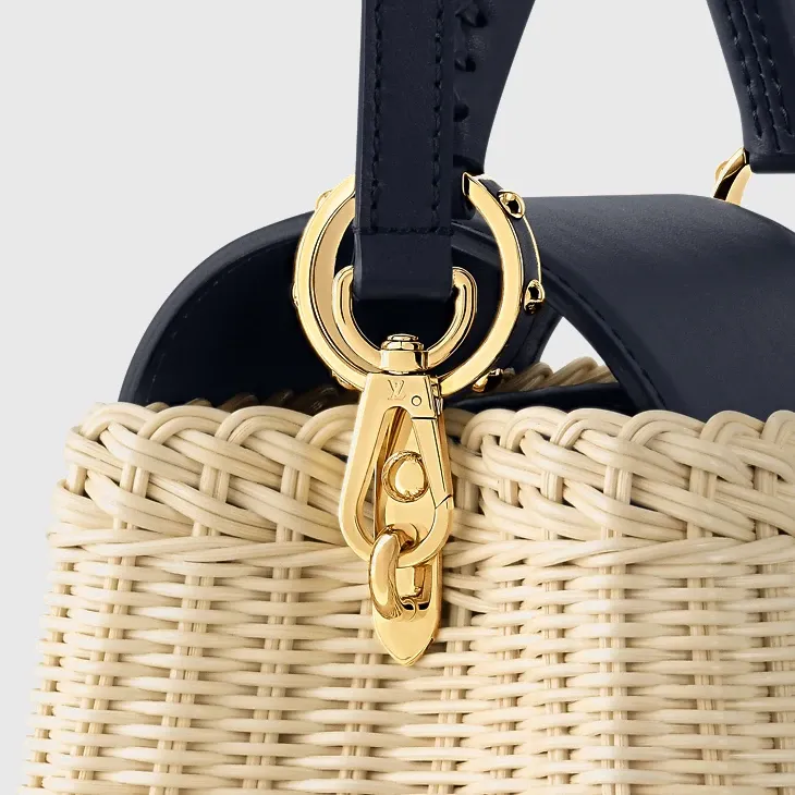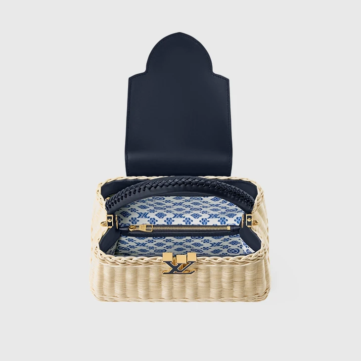 This Capucines BB is handwoven from rattan, with each one-of-a-kind design taking two days to complete. Lending a resort-inspired aesthetic, it is evocative of the House’s Picnic Trunk from 1892 and opens to reveal a patterned lining. It can be worn with the flap styled inside or out, and is sized to fit everyday essentials. The signature LV Initials add the final flourish.