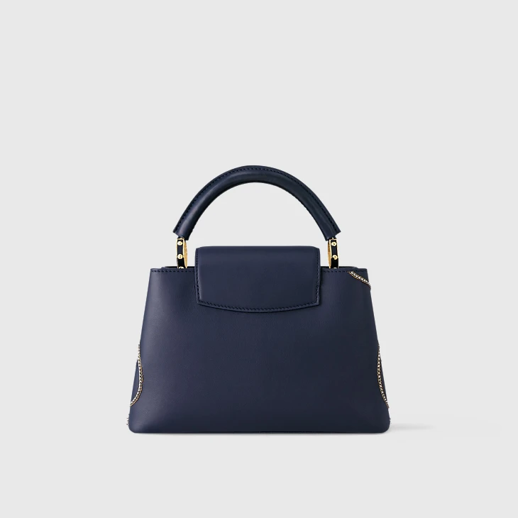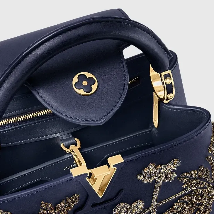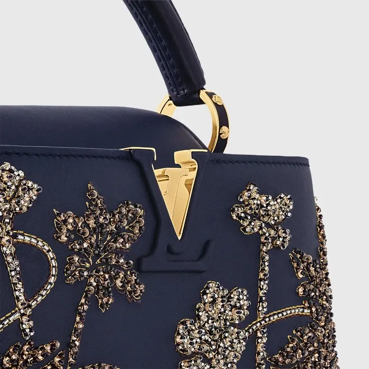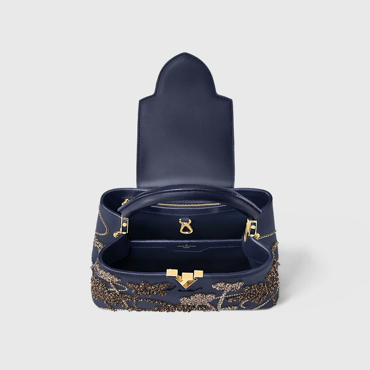 The Capucines Fleurs d’Asnières handbag honors Louis Vuitton’s historic home and the Maison’s heritage of exceptional craftsmanship. The bag’s floral motifs recall the Art Deco interior at Asnières: Using crochet and needlepoint chain stitches, expert artisans have hand-embroidered the beads with golden thread on a background of navy-blue satin. A most feminine accessory, for very special evenings.