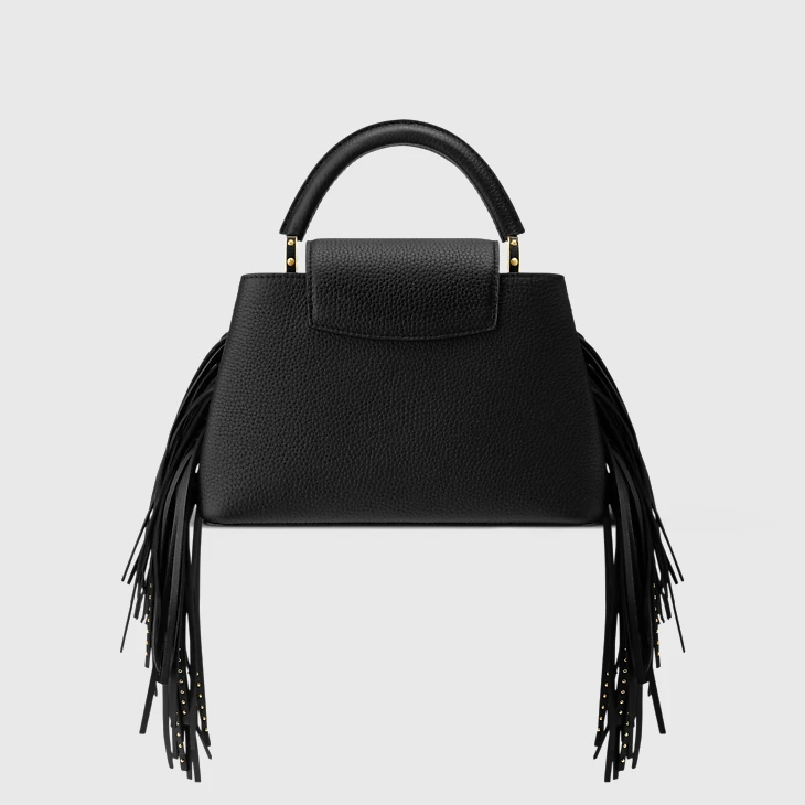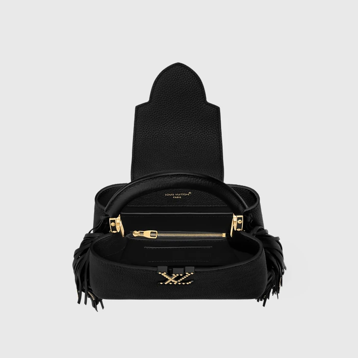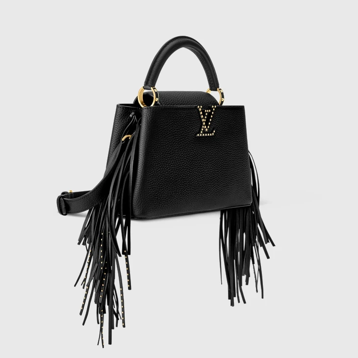Defined by hand-braided fringing, this Western-inspired edition of the Capucines BB is a statement choice for the season ahead. The double-carry style is crafted from Taurillon leather and is embellished with gold-toned studs that form the shape of the House’s signature LV Initials. It can be worn cross-body, over the shoulder or carried by hand.