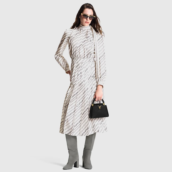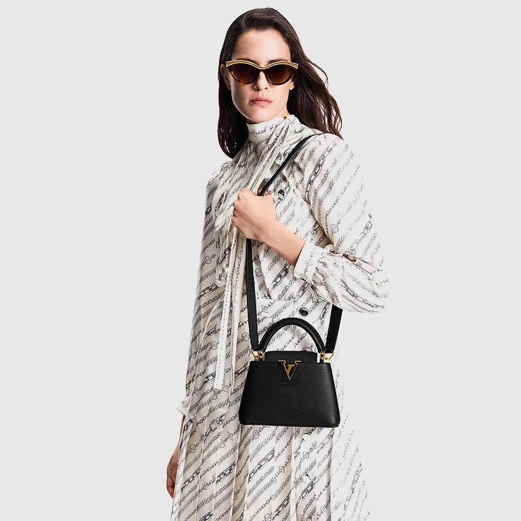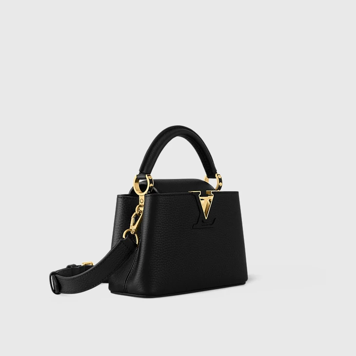 The refined Capucines Mini handbag looks stunningly chic in rich black Taurillon leather finished with golden handle rings and the emblematic LV Initials. This smaller version of the classic Capucines is a pleasure to carry over the shoulder or cross-body thanks to its removable strap.