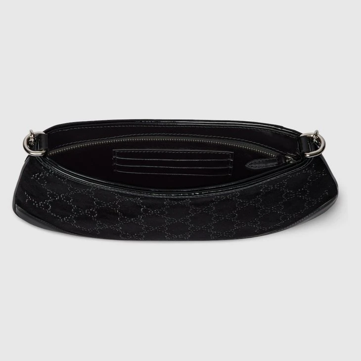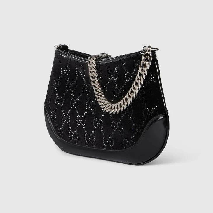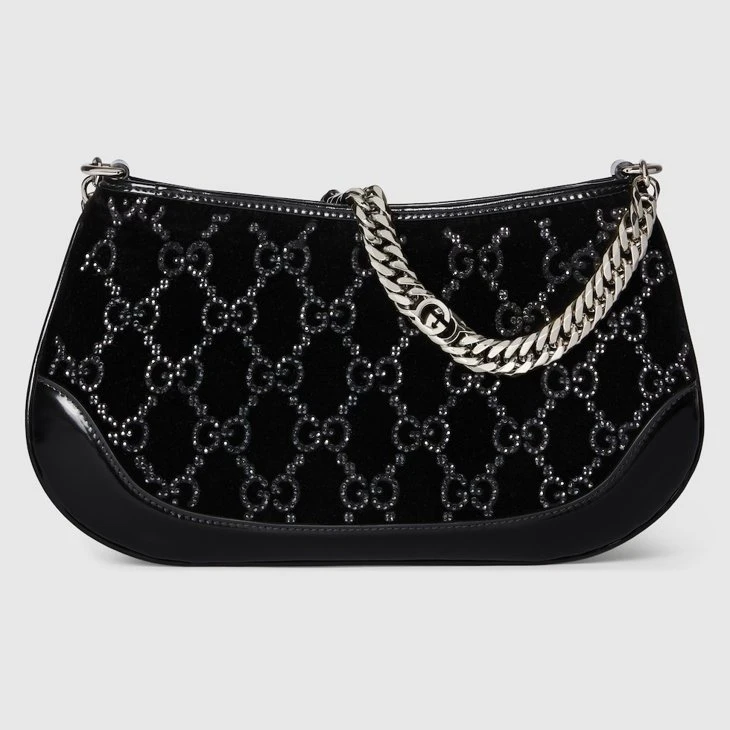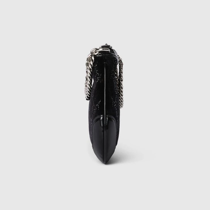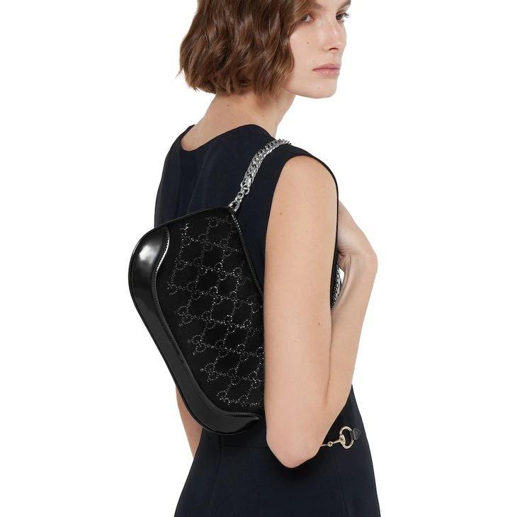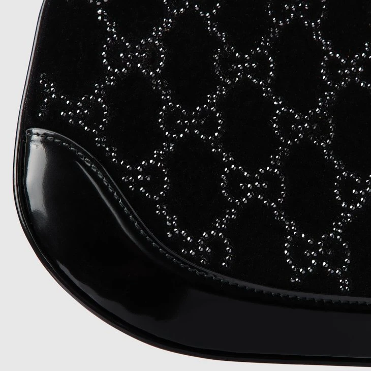 The shoulder bag features a sleek, structured silhouette and a light-catching finish. Complete with a chain strap and compact proportions, it’s designed to elevate any look from day to night.Black GG velvet with crystals