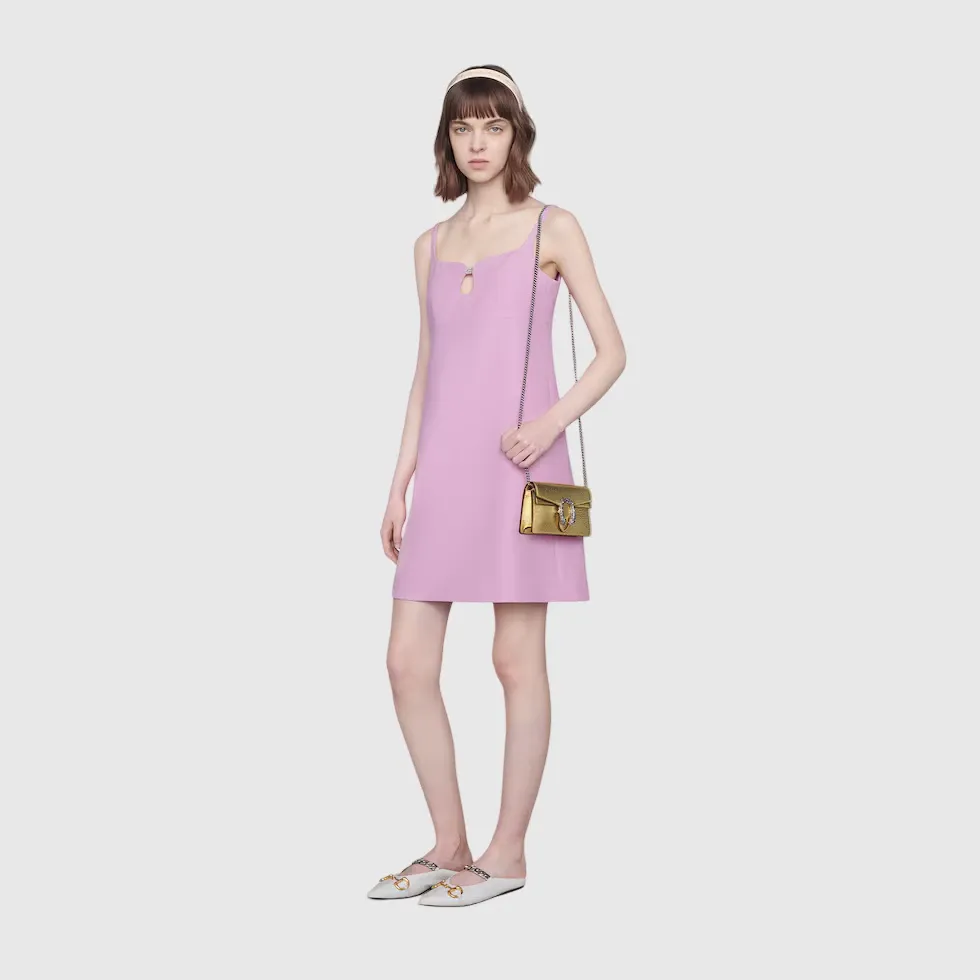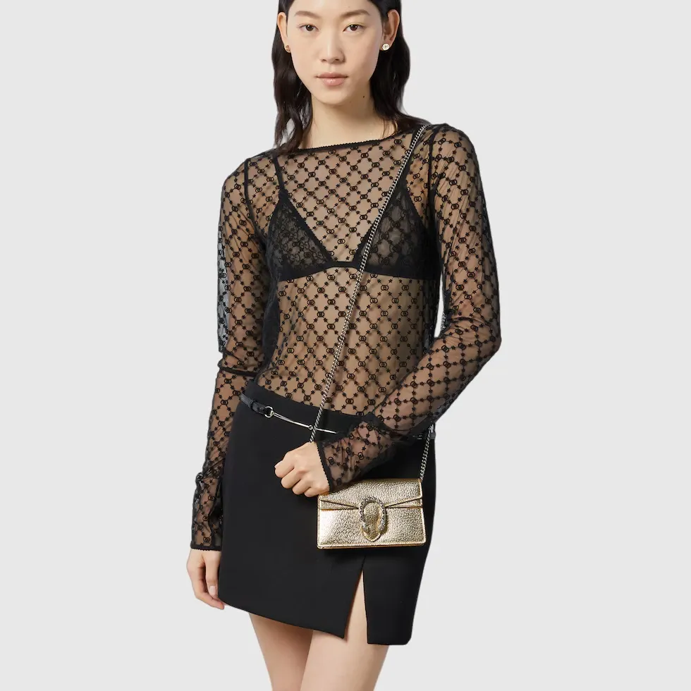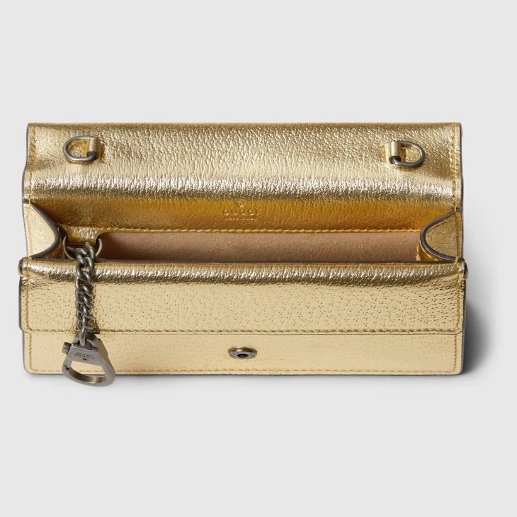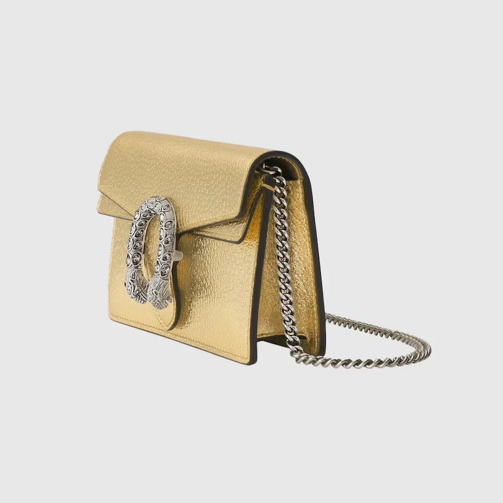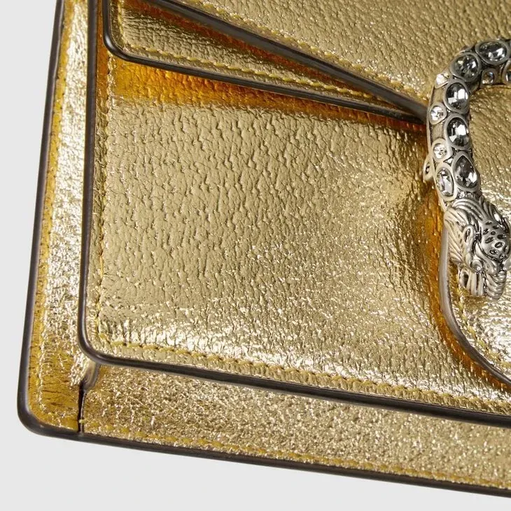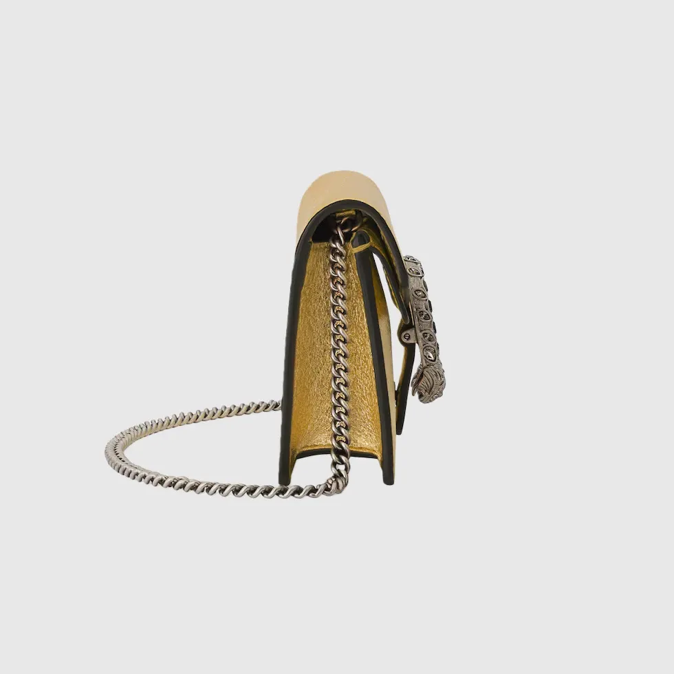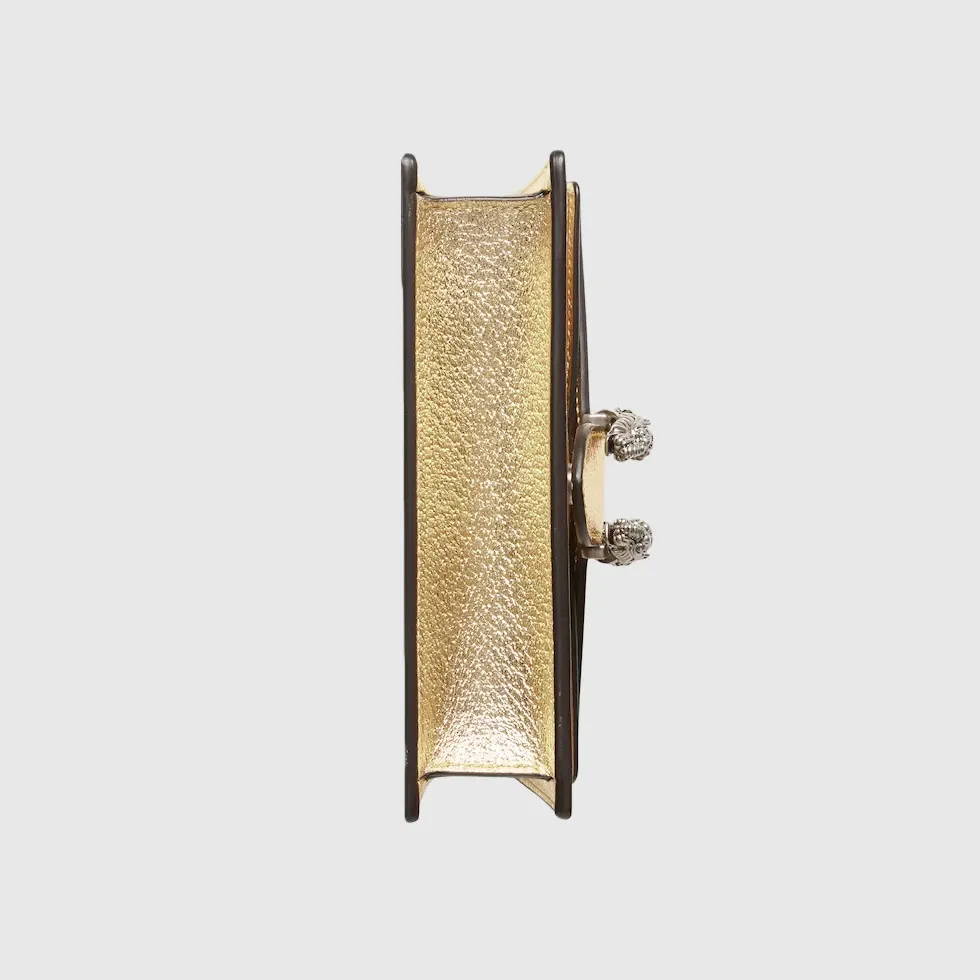 The structured mini bag is introduced in metallic gold leather, with a key ring that can be used to attach the bag to a separate larger bag. The closure features the textured tiger head spur—the unique detail defines the line, referencing the Greek god Dionysus, who in myth is said to have crossed the river Tigris on a tiger sent to him by Zeus.Gold lamé leather