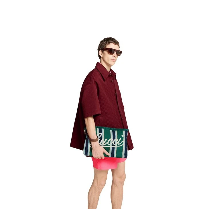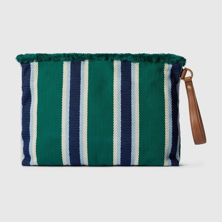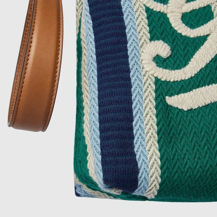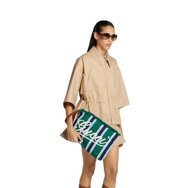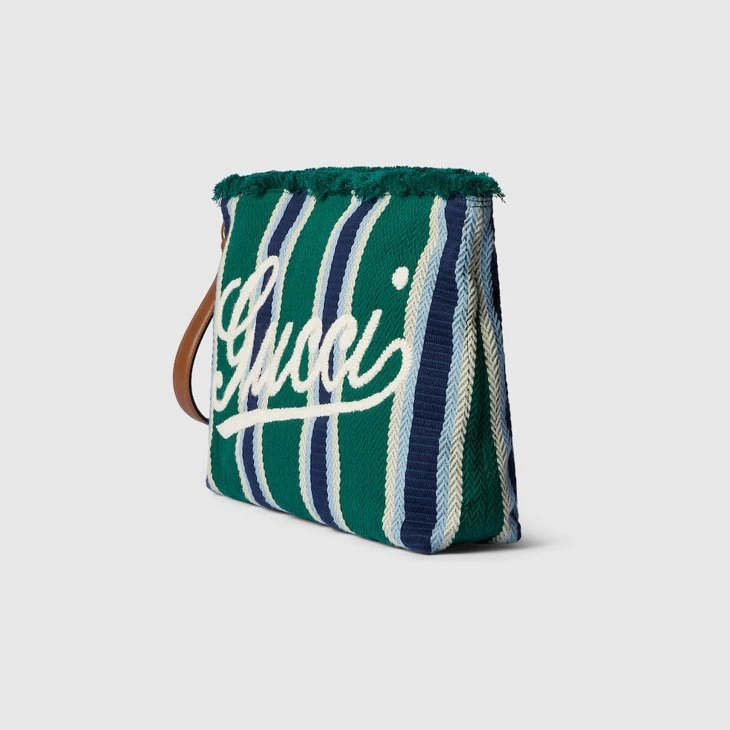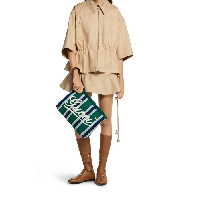 The Spring Summer 2025 men’s collection speaks of freedom, energy and community through the latest selection of small leather goods and men’s bags fit for new adventures. This pouch appears in an eye-catching striped herringbone cotton canvas, complete with a Gucci script embroidery across the front.Green and multicolored striped herringbone cotton canvas