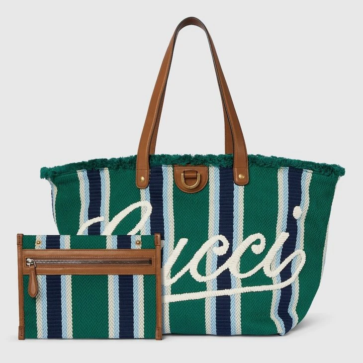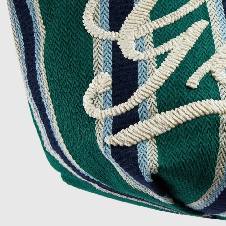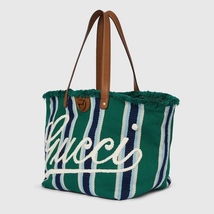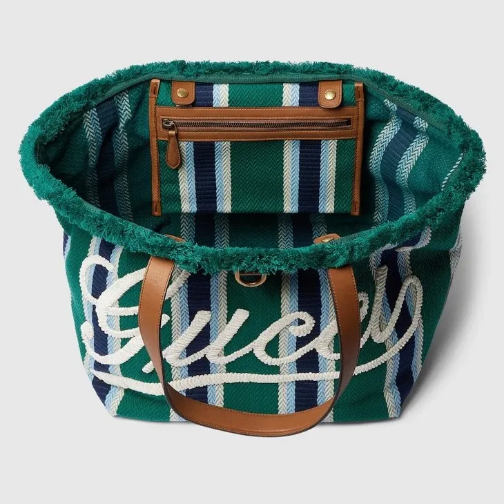The Spring Summer 2025 men’s collection speaks of freedom, energy and community through the latest selection of travel pieces and men’s bags fit for new adventures. This tote bag appears in an eye-catching striped herringbone cotton canvas, complete with a Gucci script embroidery across the front.Green and multicolored striped herringbone cotton canvas