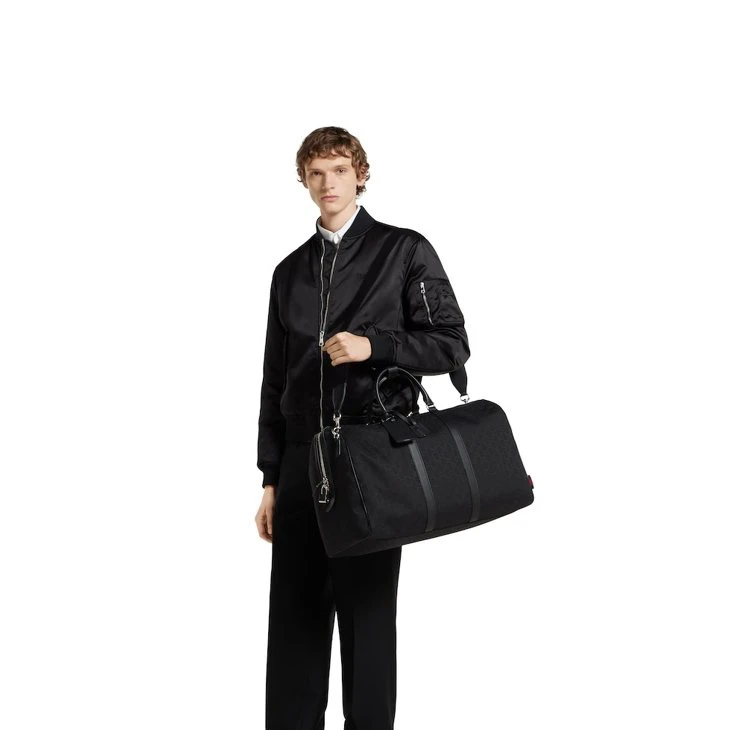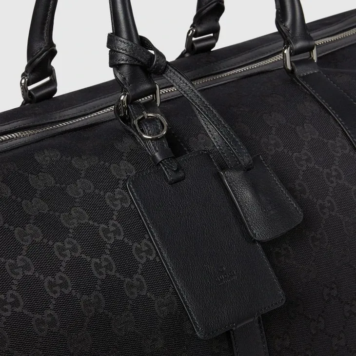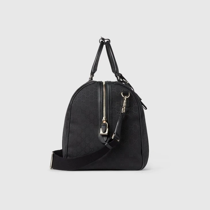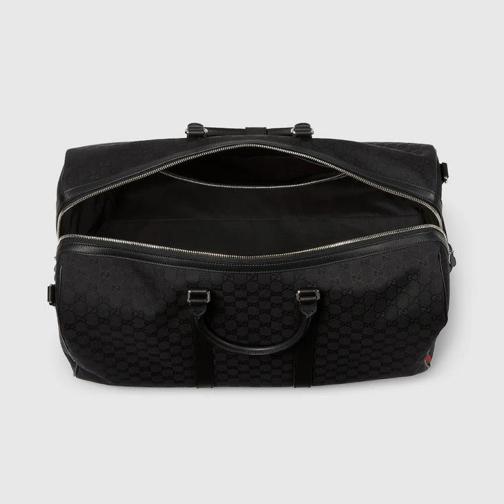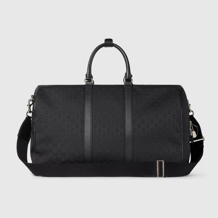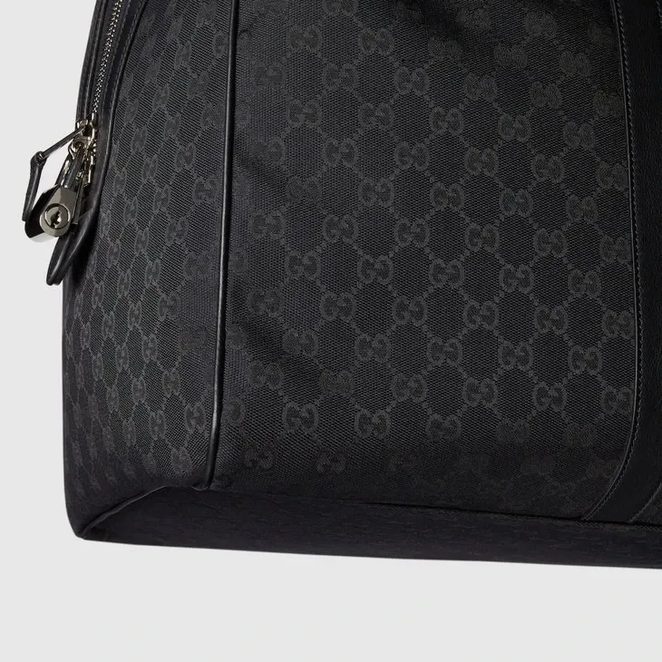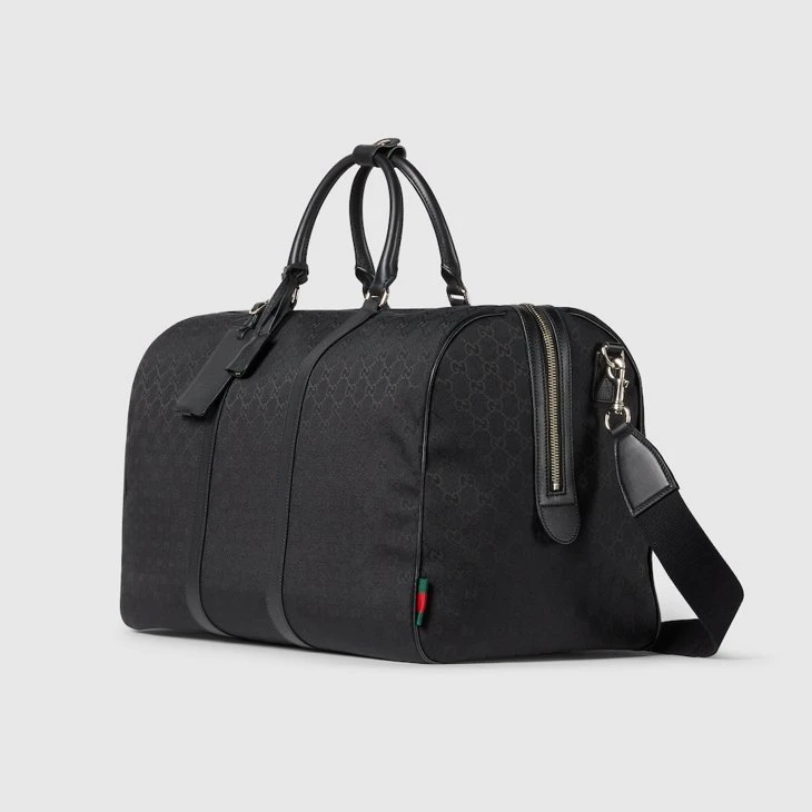 Part of the Pre-Fall 2025 collection, the men’s bag selection blends sleek lines with heritage emblems. This duffle bag is presented in a black GG canvas and completed with a green and red Web detail.Black GG canvas