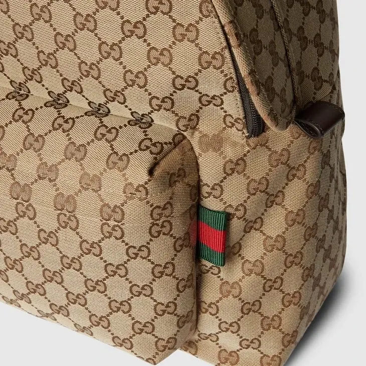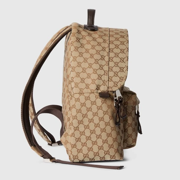 In the Spring Summer 2025 collection, softly-structured men’s bags combine craftsmanship and functionality with a smooth texture and practical closures. This backpack appears in beige and dark brown GG canvas. A subtle embossed Gucci logo defines the base.Beige and dark brown GG canvas
