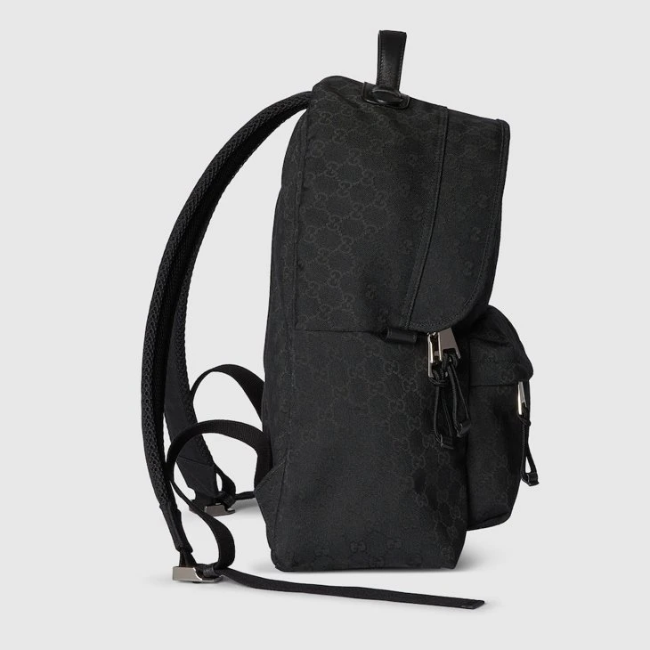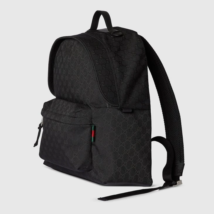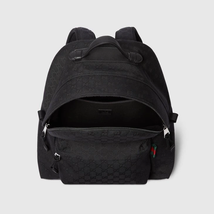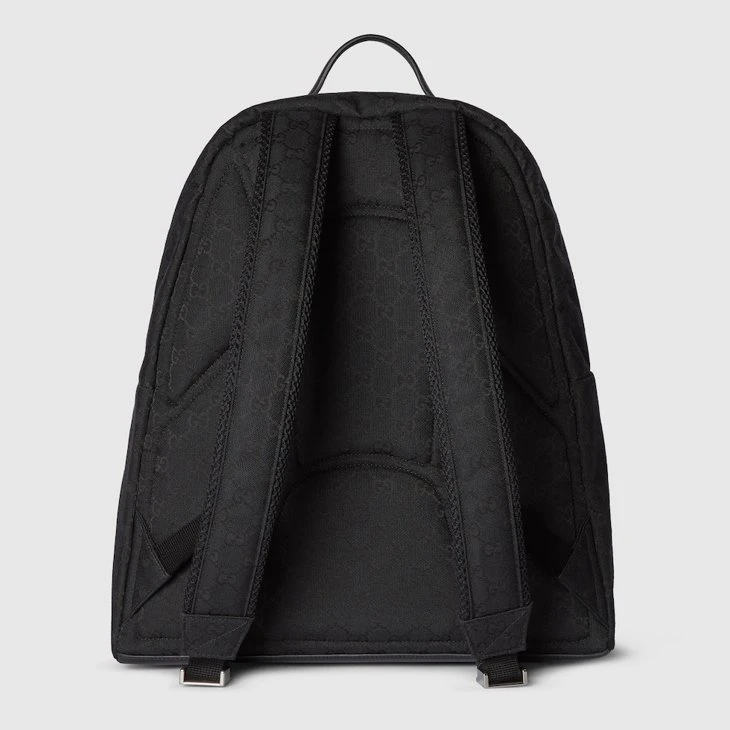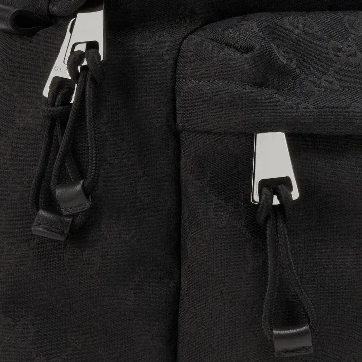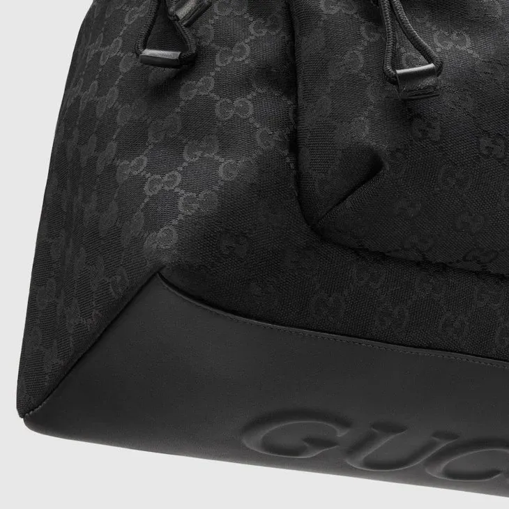 In the Spring Summer 2025 collection, softly-structured men’s bags combine craftsmanship and functionality with a smooth texture and practical closures. This backpack appears in all black GG canvas. A subtle embossed Gucci logo defines the base.Black GG canvas