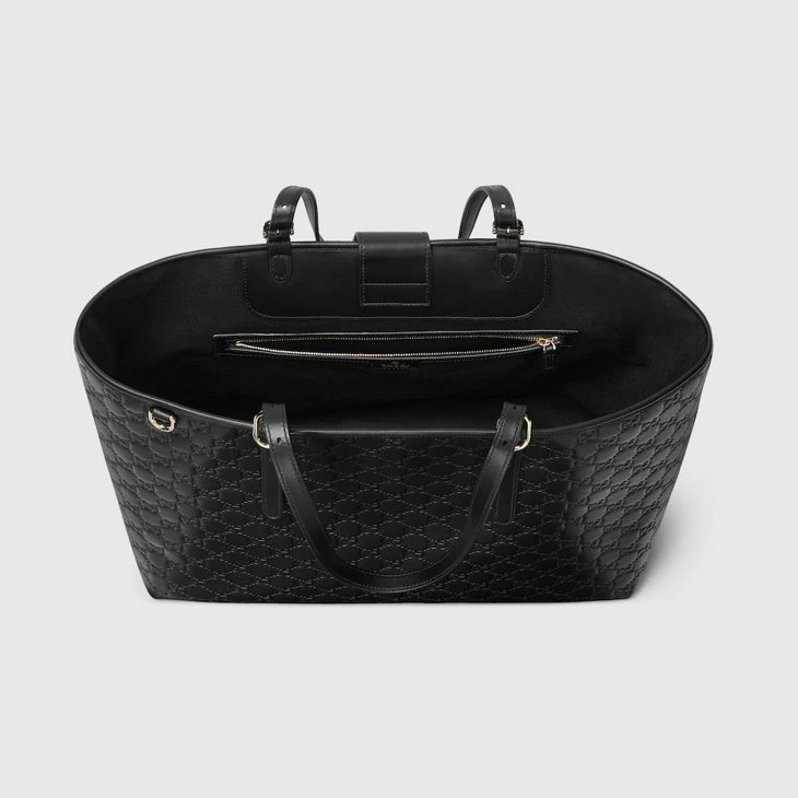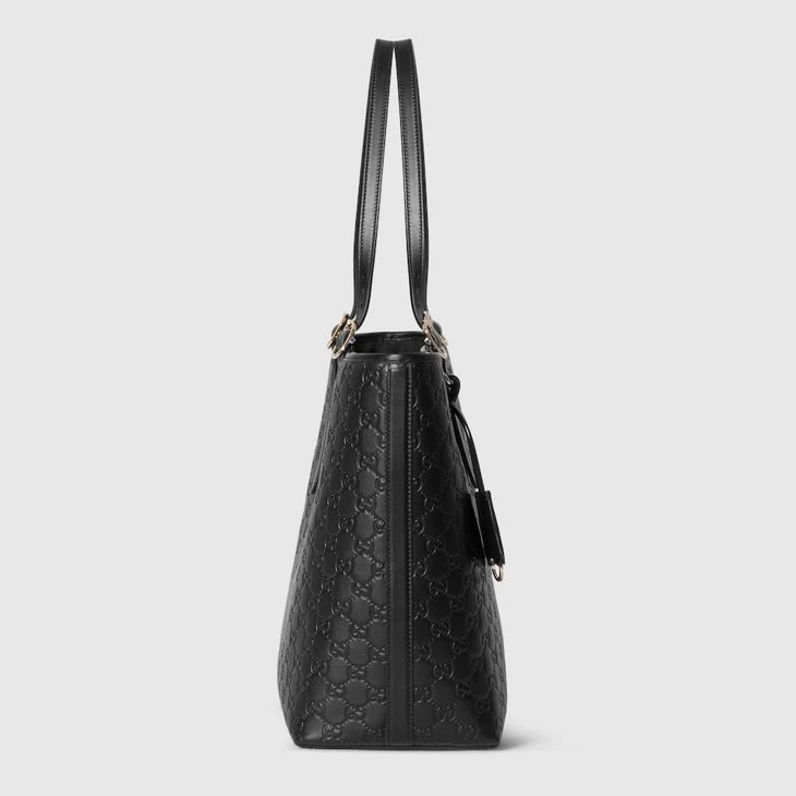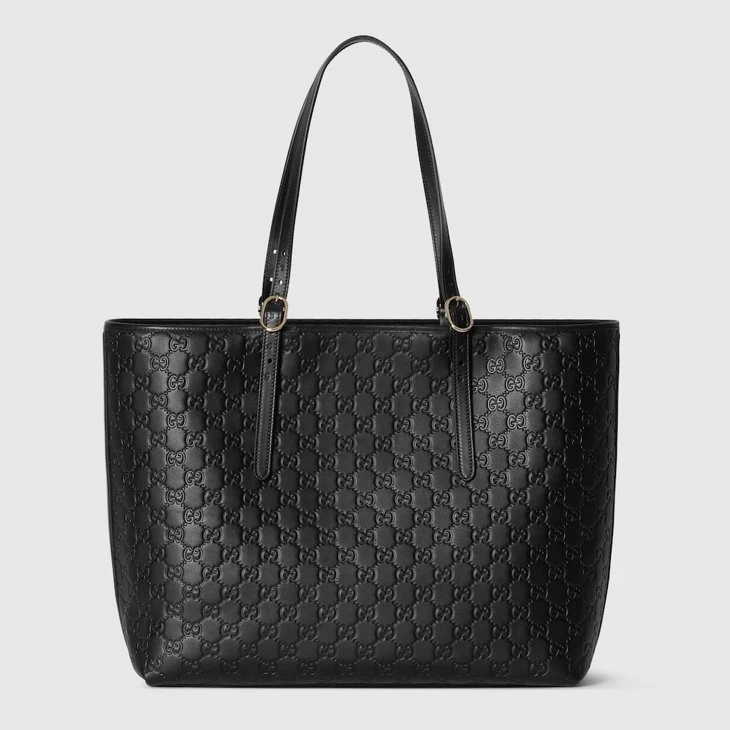 In the Fall Winter 2025 collection, the new GG Emblem collection reinterprets the House’s history of elegance and craftsmanship. This tote bag is crafted from embossed GG leather.Black embossed GG leather