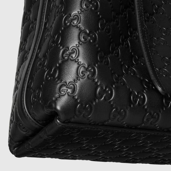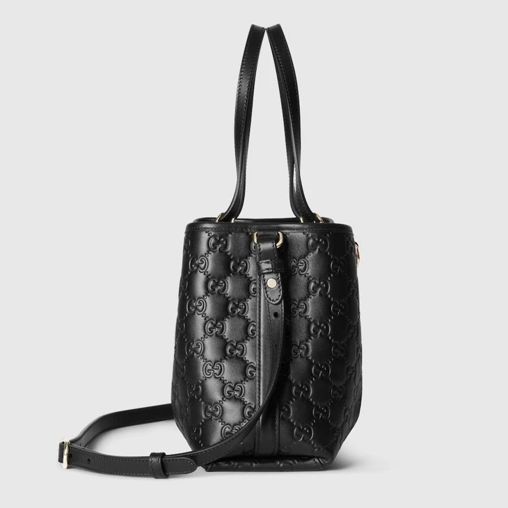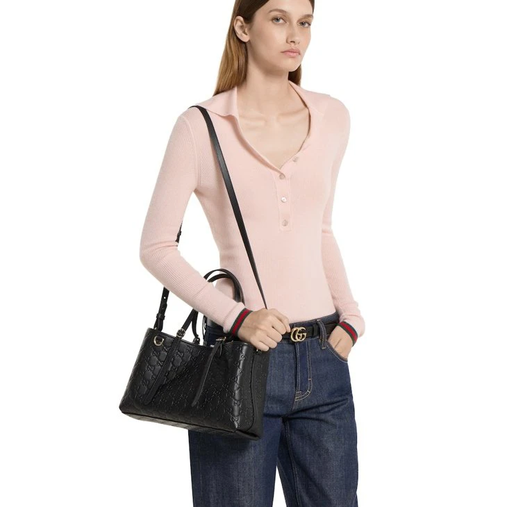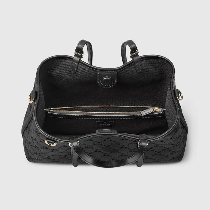 The GG Emblem collection reinterprets the House’s history of elegance and craftsmanship. This tote bag features numbered notches on the adjustable top handles, inspired by the equestrian world.Black embossed GG leather