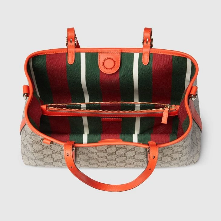 The GG Emblem collection reinterprets the House’s history of elegance and craftsmanship. This tote bag features numbered notches on the adjustable top handles, inspired by the equestrian world.Beige and dark brown GG Monogram coated fabric