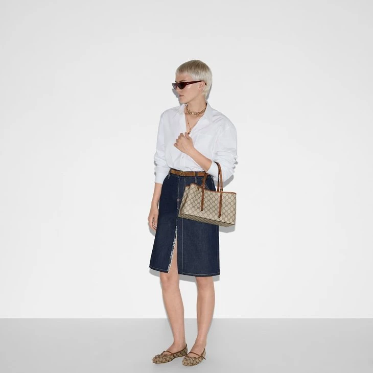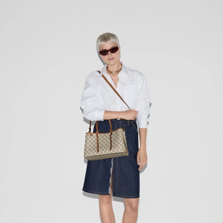 The new GG Emblem collection reinterprets the House’s history of elegance and craftsmanship. This tote bag features numbered notches on the adjustable top handles, inspired by the equestrian world.Beige and dark brown new GG Monogram coated fabric