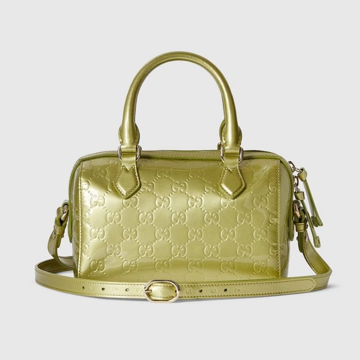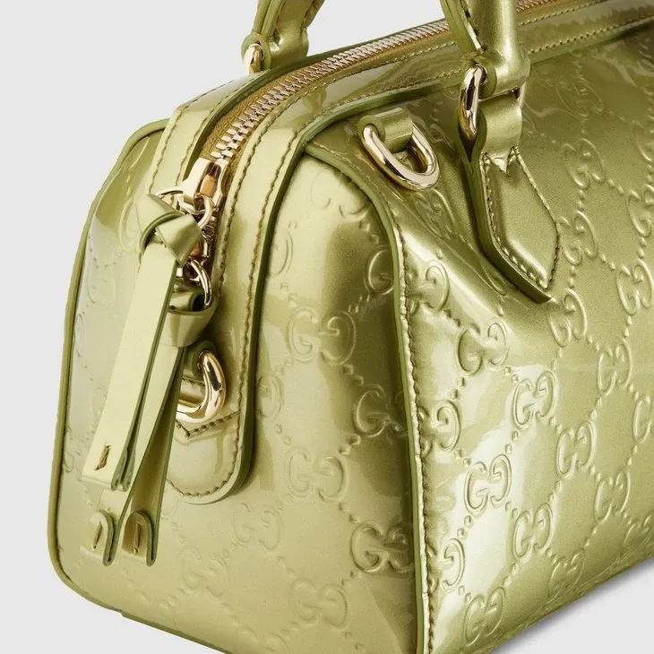 In the Fall Winter 2025 collection, the GG Emblem collection reinterprets signature motifs through creativity and innovative functions. This boston bag is crafted from emblematic embossed GG leather. The design comes with an adjustable leather shoulder strap and a secure zip closure.Pale green patent GG leather