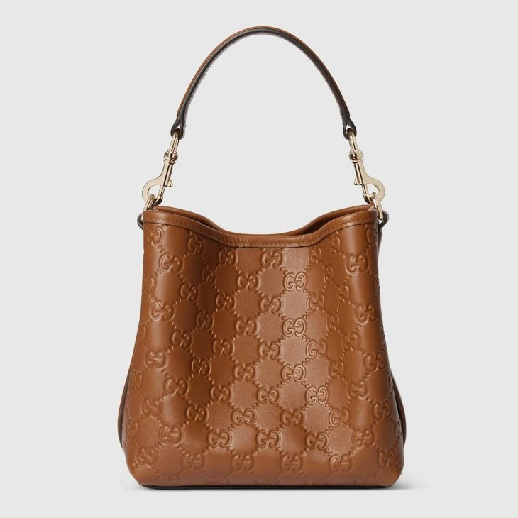 In the Fall Winter 2025 collection, the GG Emblem collection reinterprets the House’s history of elegance and craftsmanship. This bucket bag highlights functional design with an interior compartment, in matching cotton lining.Brown embossed GG leather
