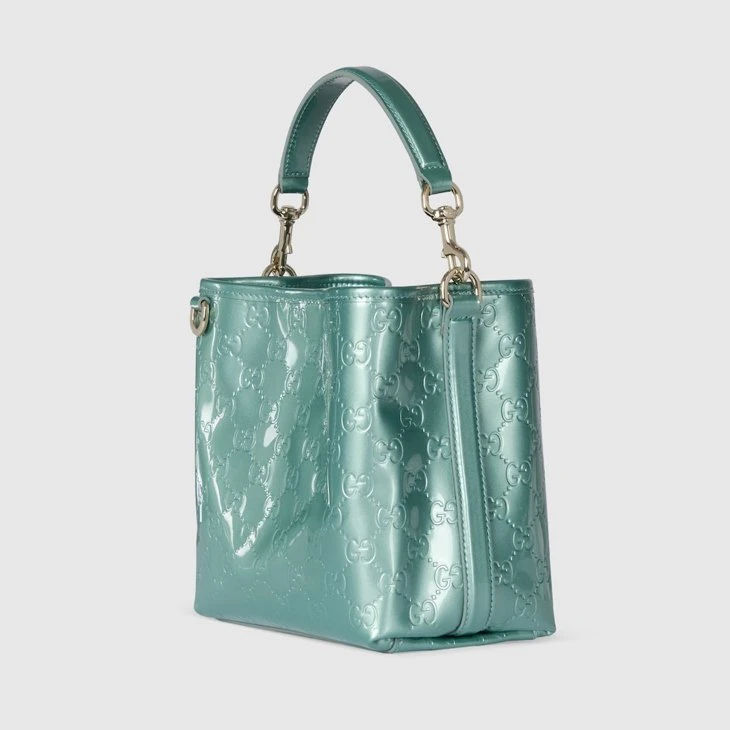 The new GG Emblem collection reinterprets the House’s history of elegance and craftsmanship. This bucket bag highlights functional design with an interior compartment, in cotton lining.Light blue patent GG leather