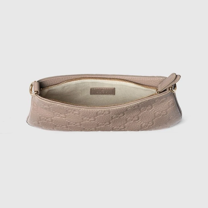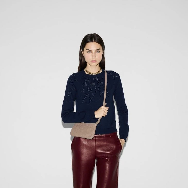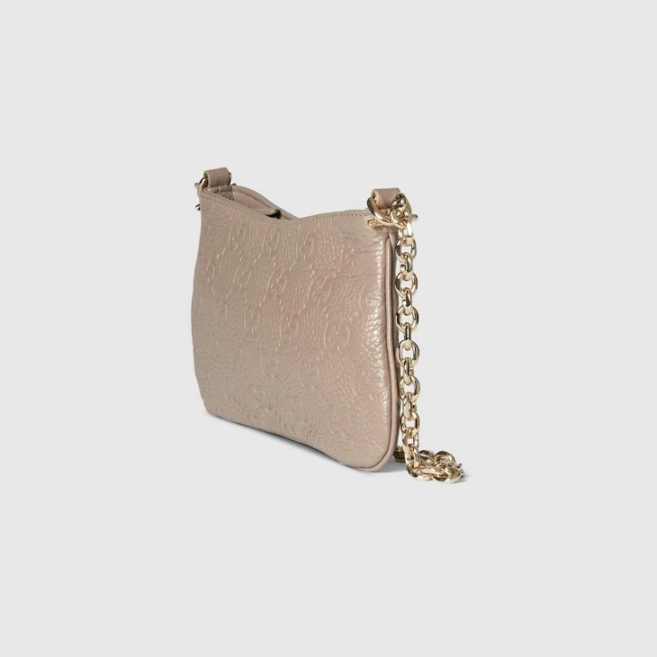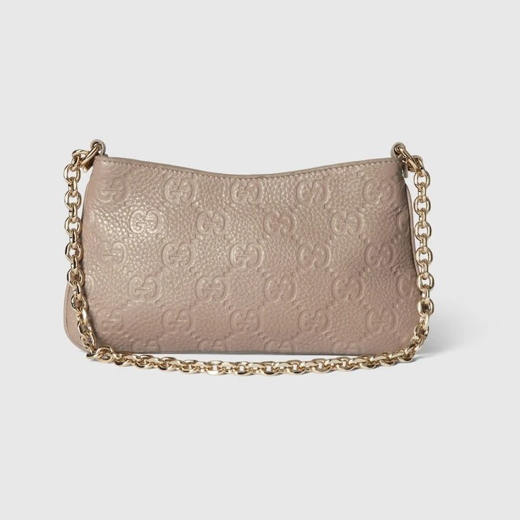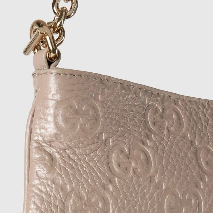 Reinforcing the timelessness of the GG motif, various small accessories spotlight the pattern in a soft-to-touch grainy leather. Bringing contrasting textures to the latest collection, the range is also available in a variety of neutral and pastel tones. This GG Emblem small bag appears in taupe GG grainy leather.Taupe GG grainy leather