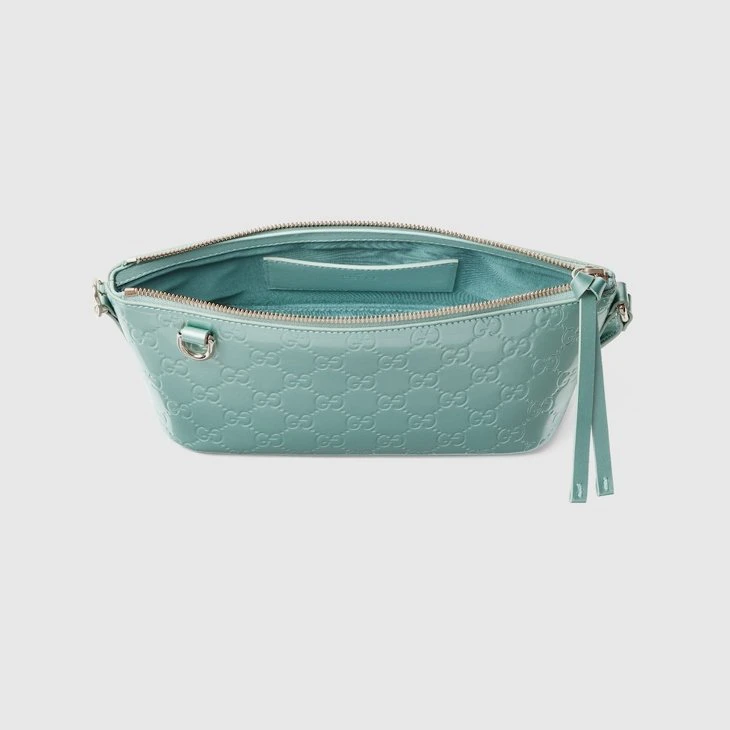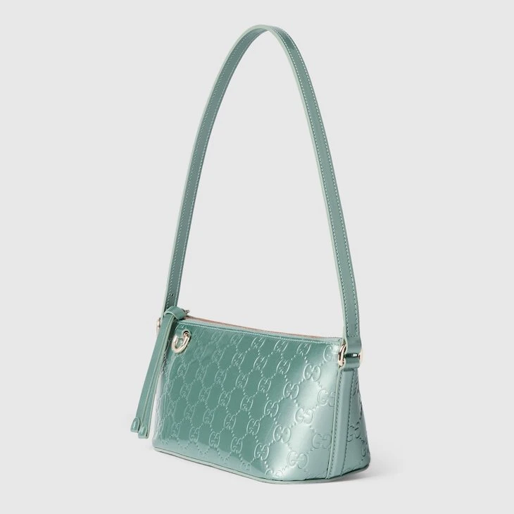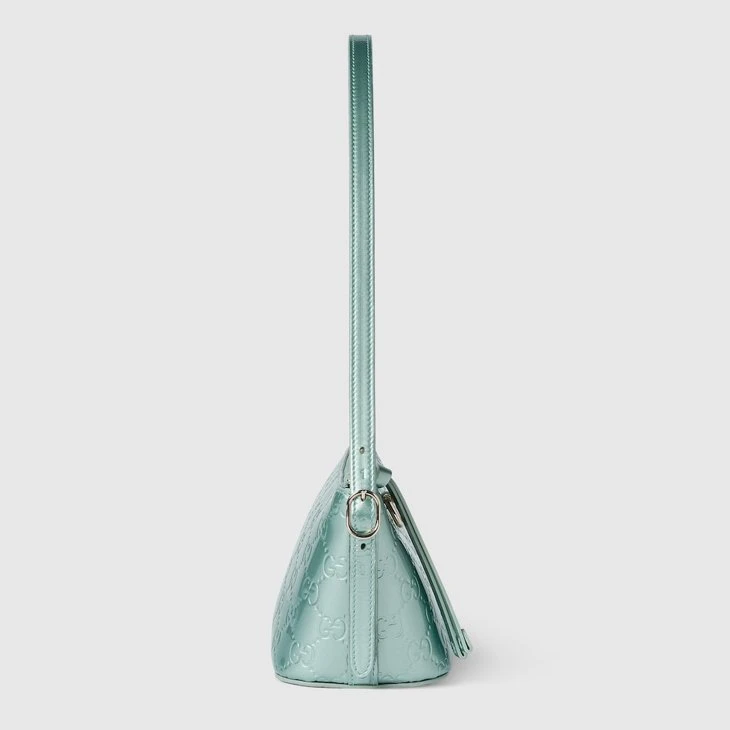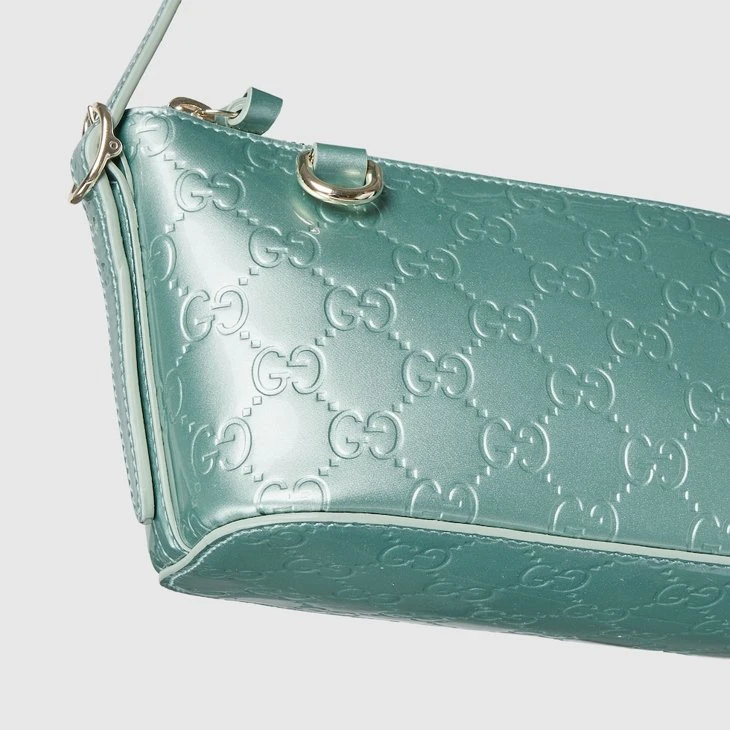 In the Fall Winter 2025 collection, defined by a compact silhouette and essential detailing, this GLight blue patent GG leather
