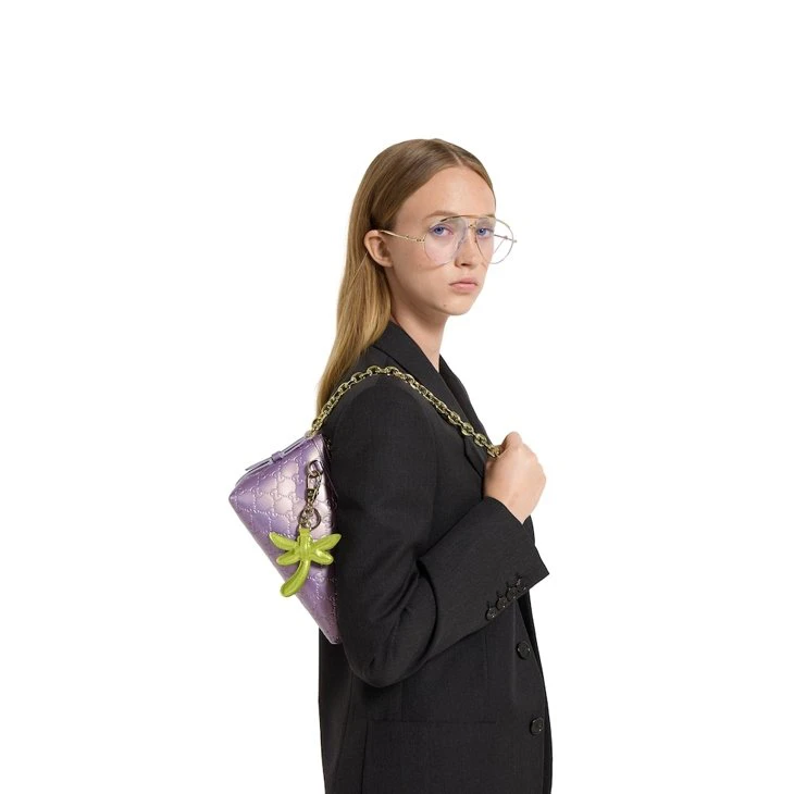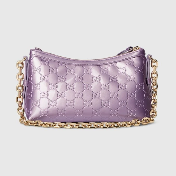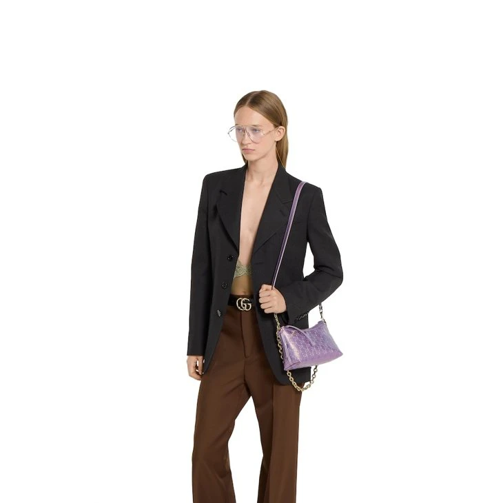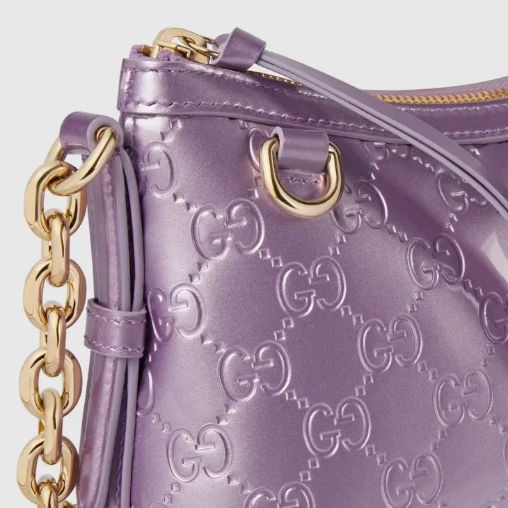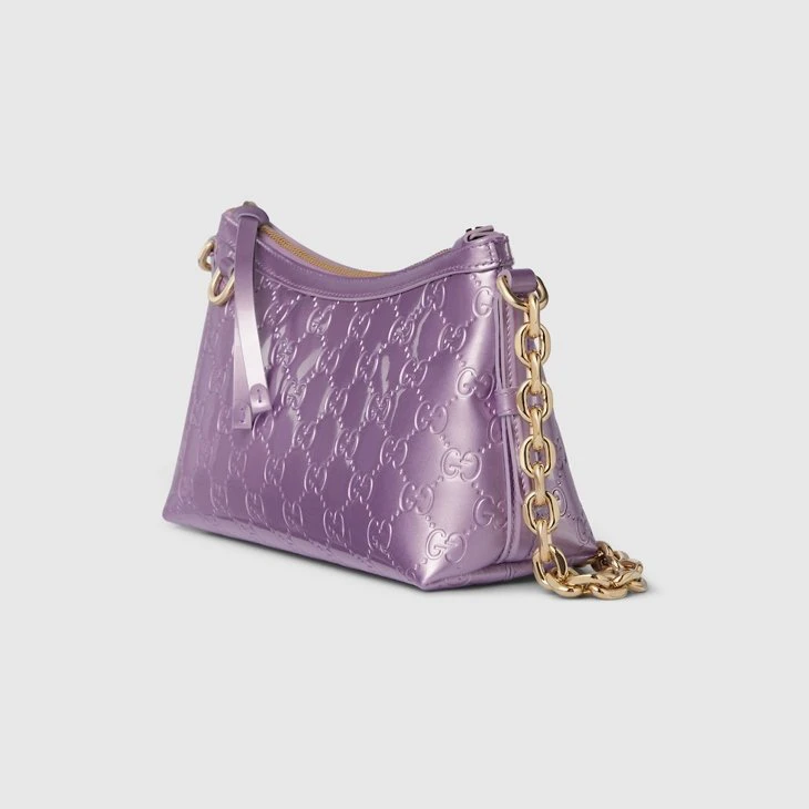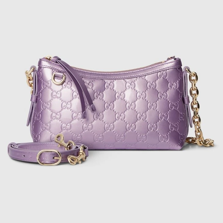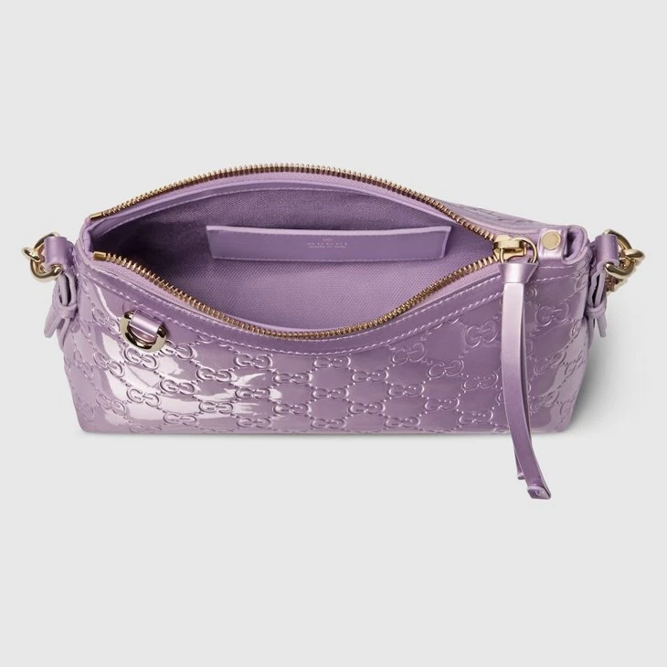 In the Fall Winter 2025 collection, the GG Emblem collection reinterprets the House’s history of elegance and craftsmanship. This shoulder bag highlights functional design with an interior compartment, in matching cotton lining.Lilac patent GG leather