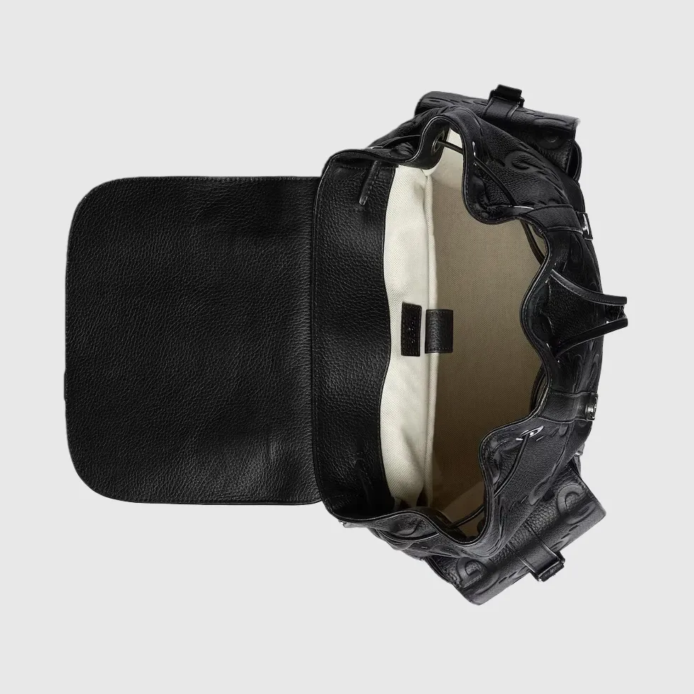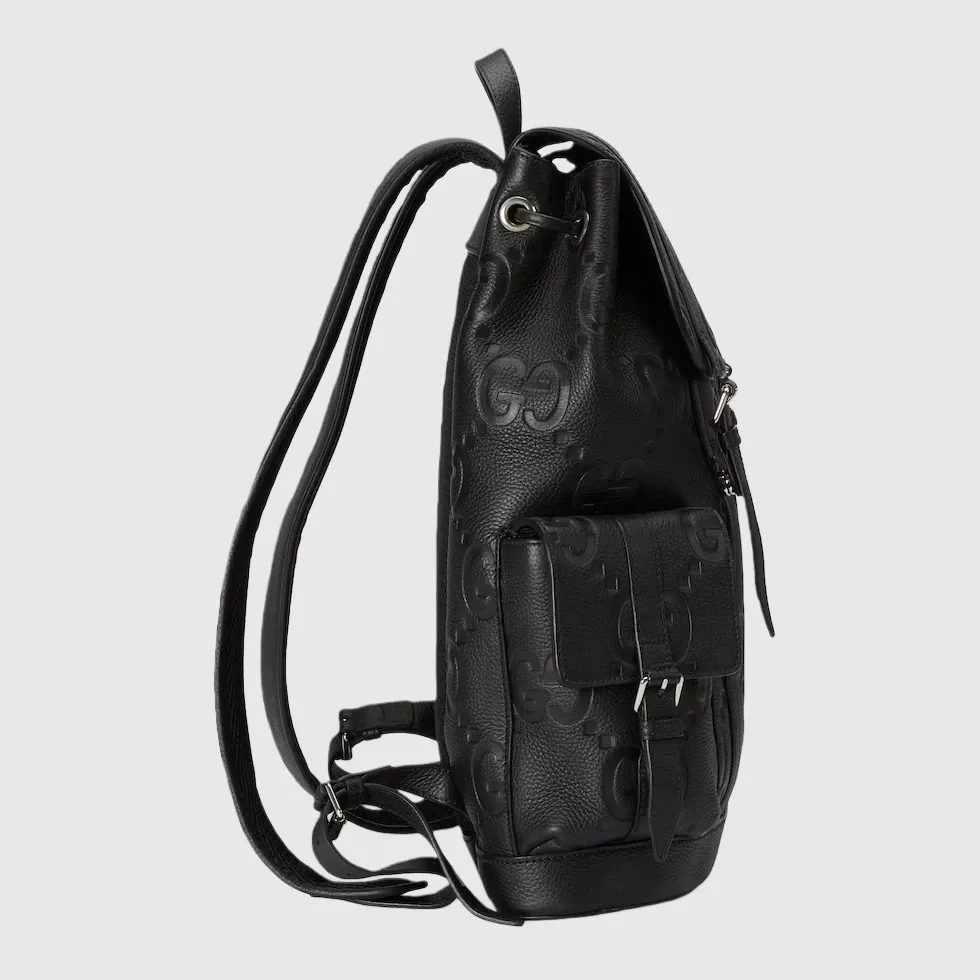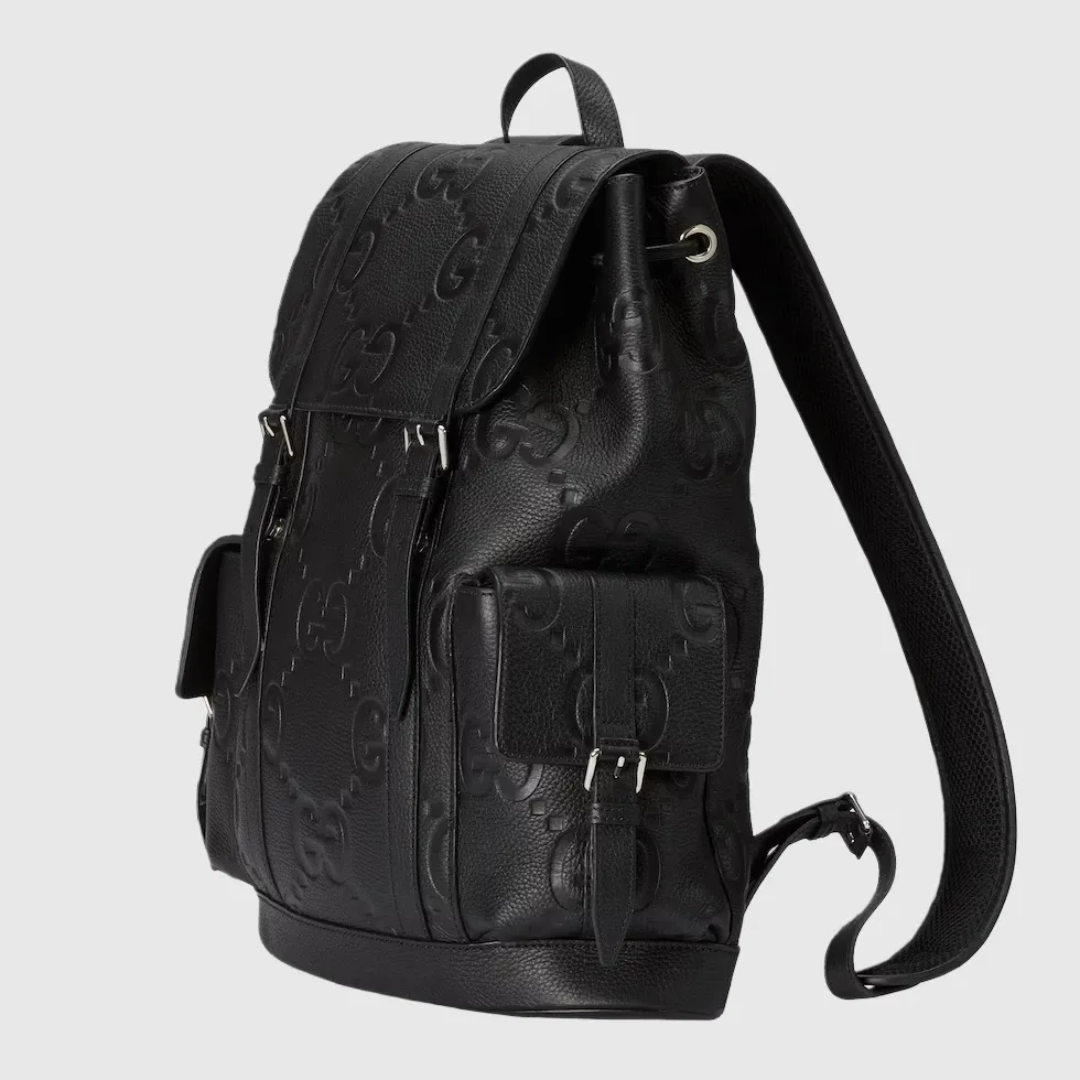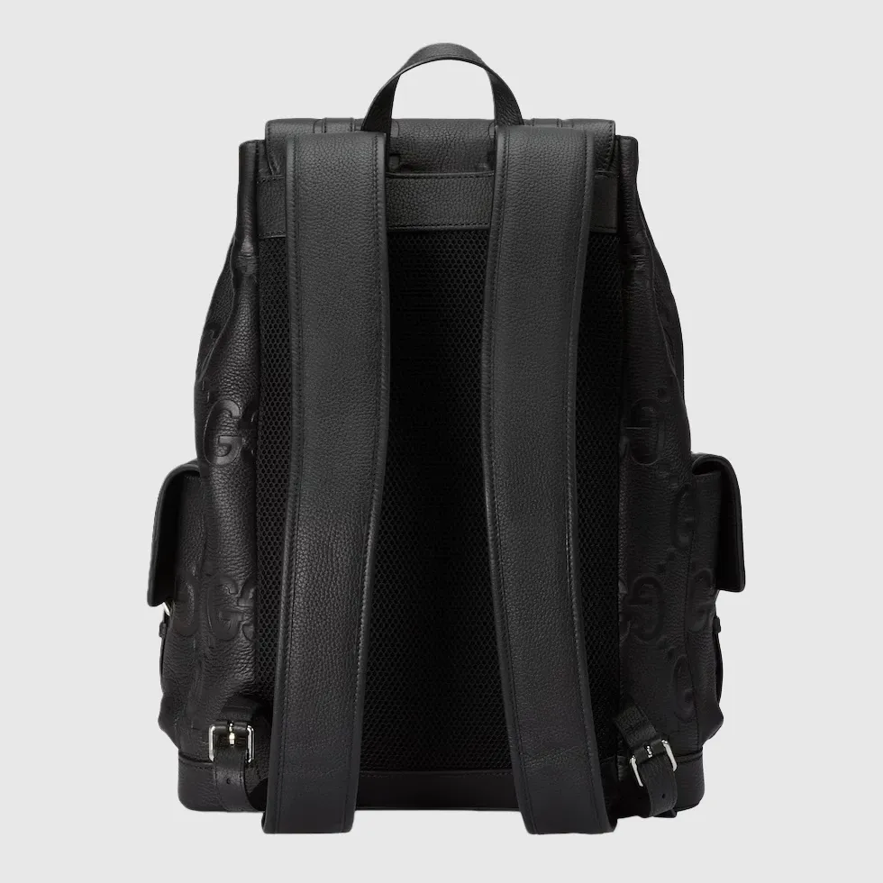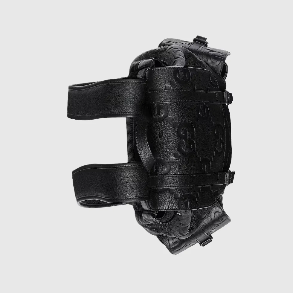 The all-black jumbo GG design returns for Pre-Fall 2023 on a selection of leather luggage pieces. A reinterpretation of Guccio Gucci’s initials, the motif is an evergreen of the House that appears prominently in maxi size for an eye-catching logo feel. This backpack in the emblematic leather features multiple pockets and easy wear shoulder straps.Black jumbo GG leather