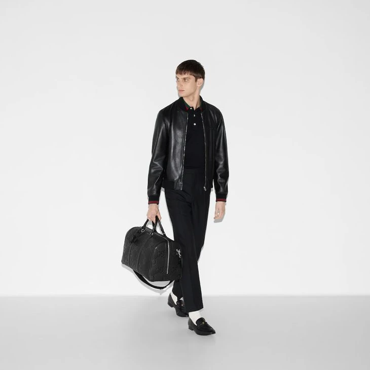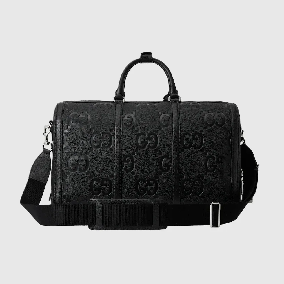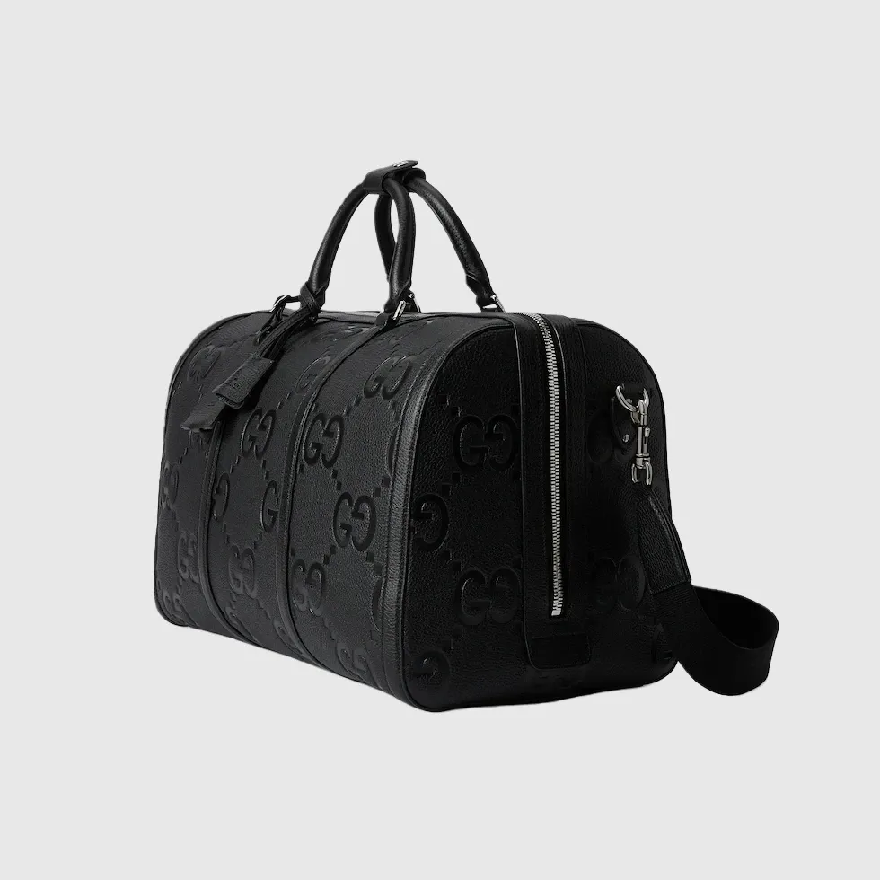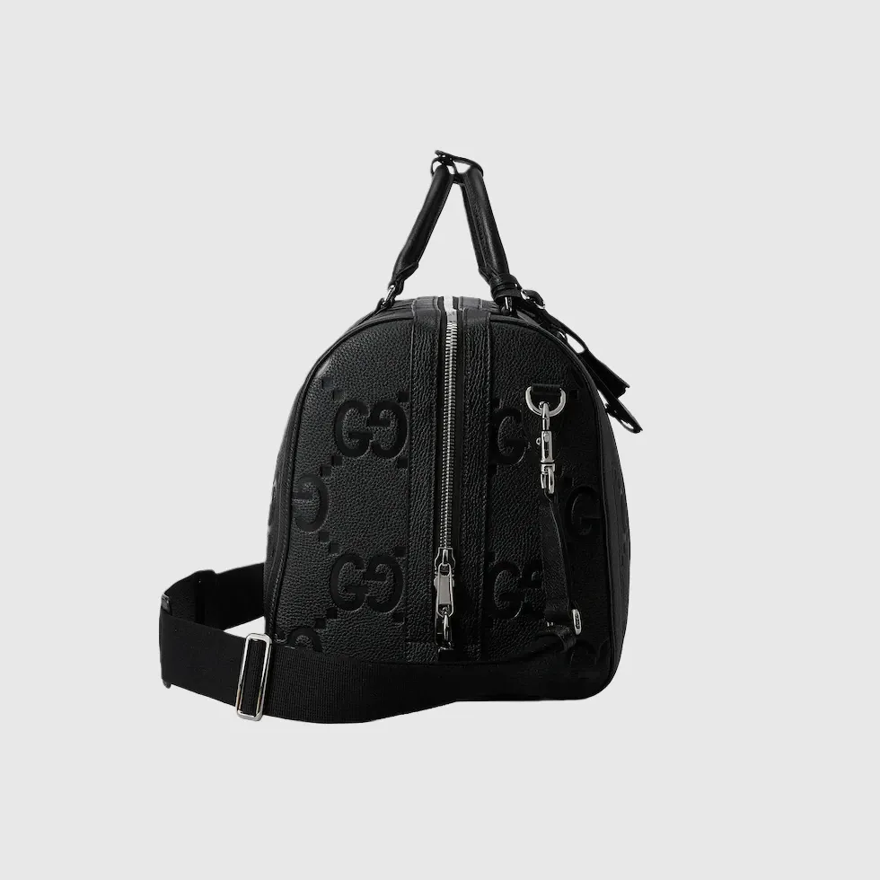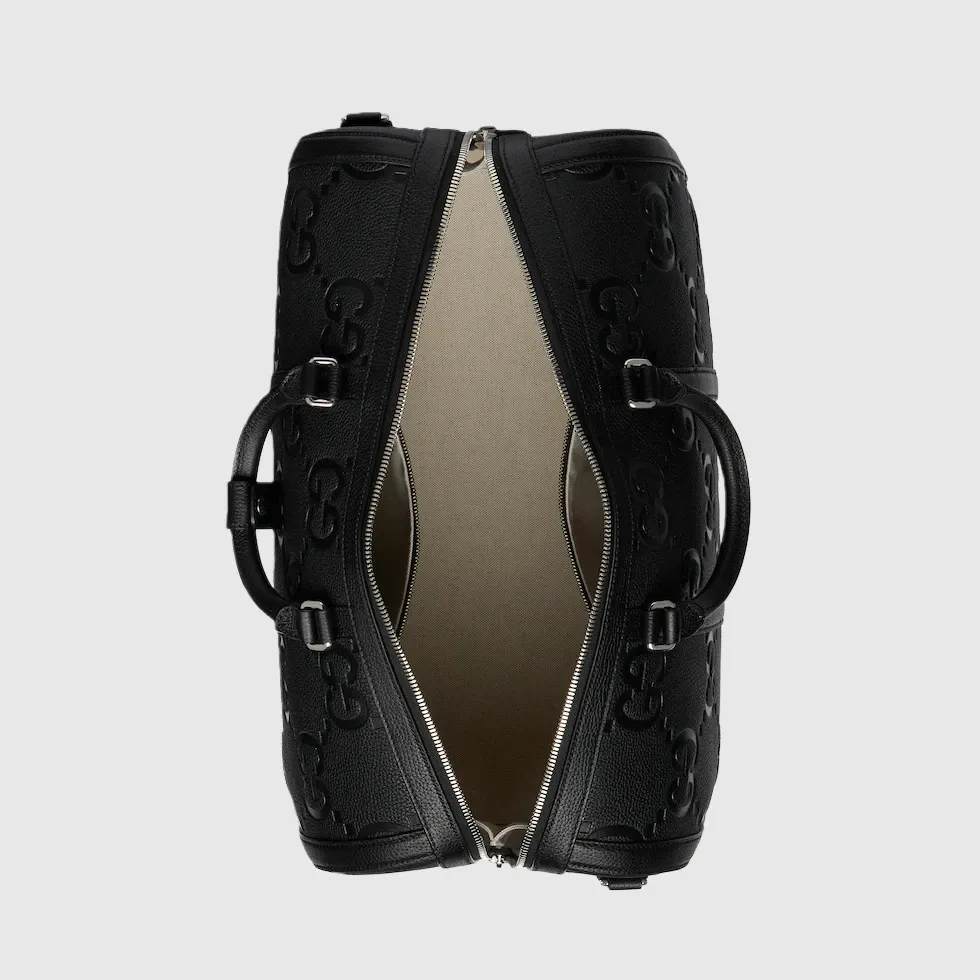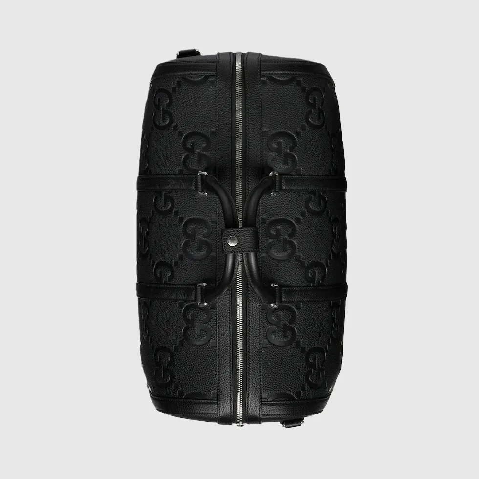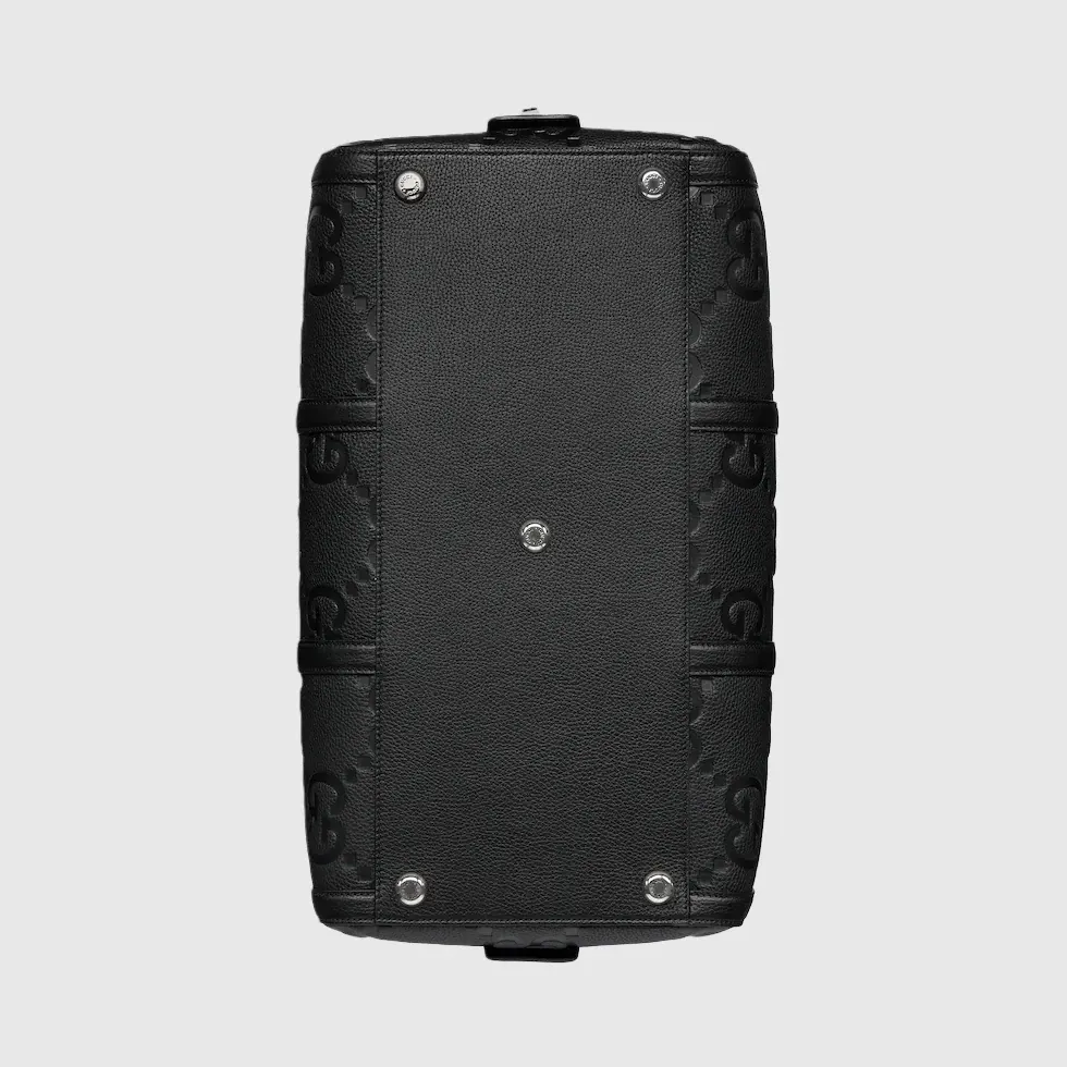 A reinterpretation of Guccio Gucci’s initials, the jumbo GG motif is an evergreen of the House that appears in maxi-sized dimensions for an eye-catching logo feel. The all-black variation of the emblem defines this duffle bag.Black jumbo GG leather