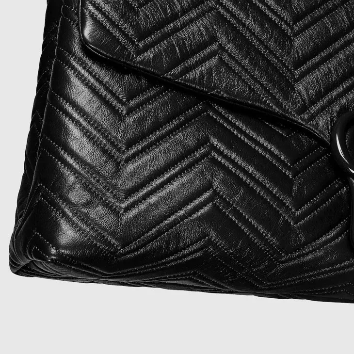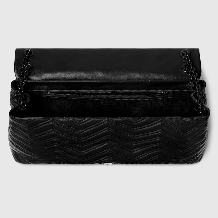 In the Fall Winter 2025 collection, the GG Marmont, a signature collection of the House, features the emblematic Double G, a faceted chain strap, and a soft, structured silhouette. This style is crafted from soft lightweight matelassé chevron leather and comes with a tonal enameled hardware and chain.Black soft lightweight matelassé chevron leather