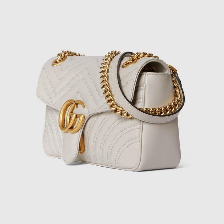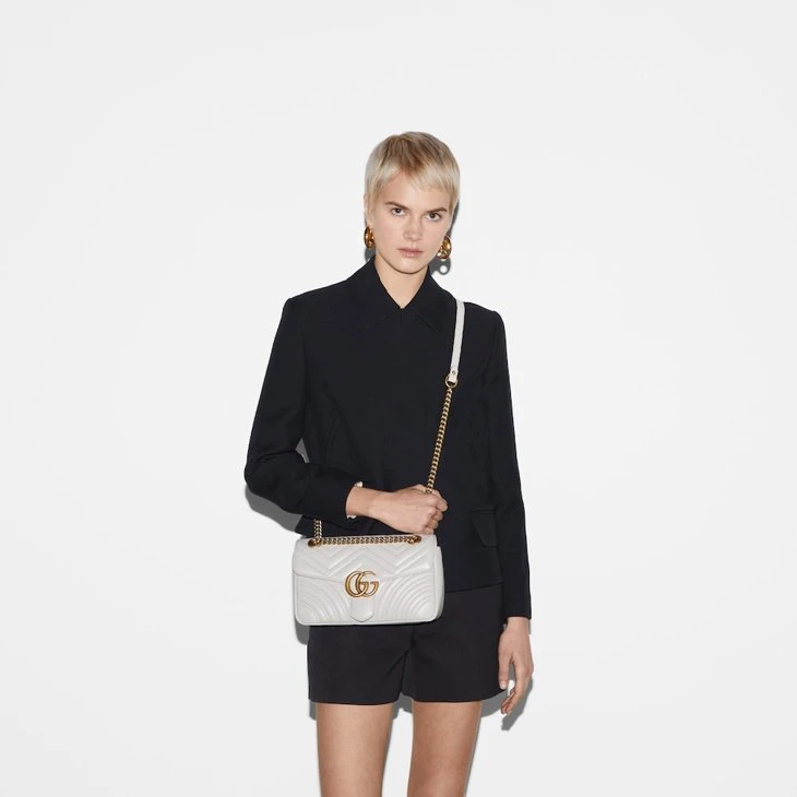 Pieces from the Spring Summer 2024 collection combine functionality with a stylish touch. Padded leather, fleece, and other fabrics are updated with new logo details. Here, the House’s signature handbags present sumptuous materials like this light grey matelassé leather with the distinctive chevron pattern that blends traditional craftsmanship and contemporary design.Light grey matelassé chevron leather