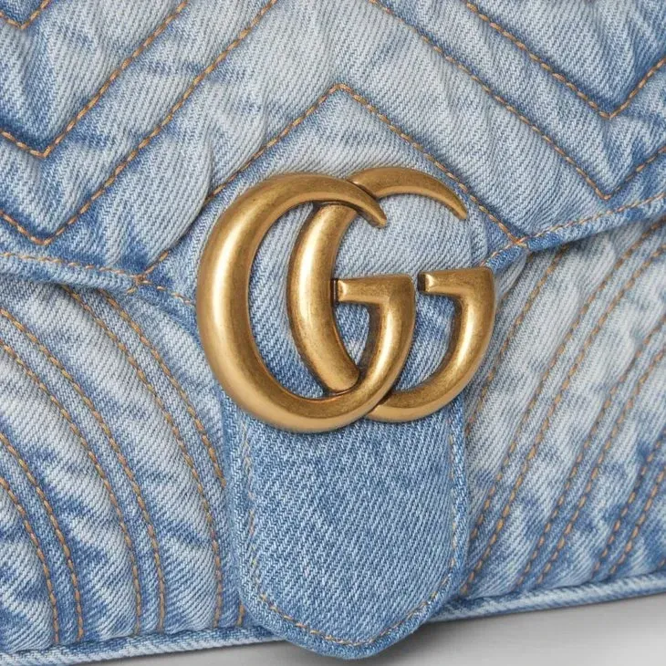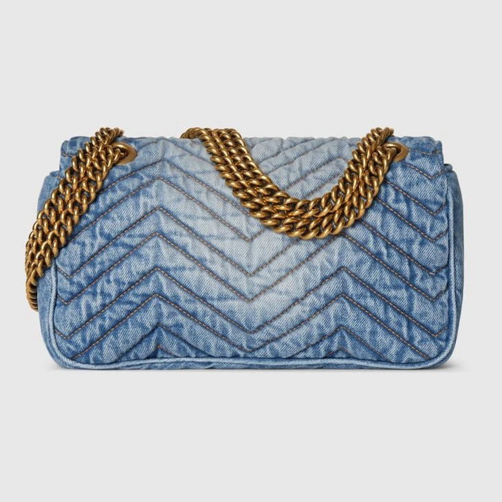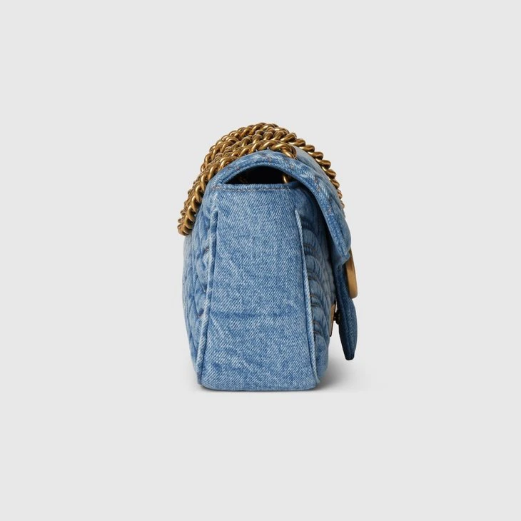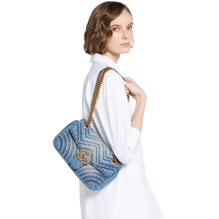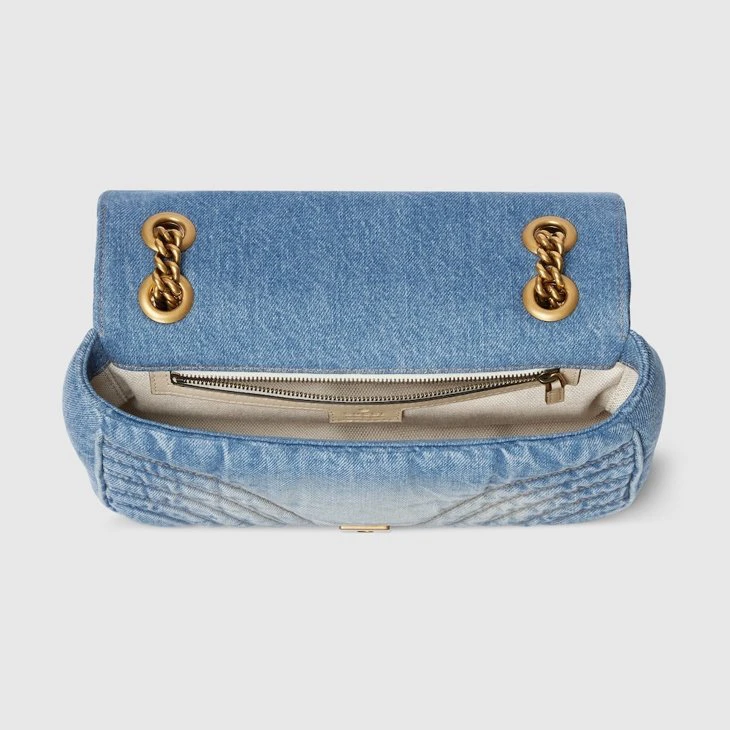 The GG Marmont, a signature collection of the House, features the Double G hardware, a faceted chain strap, and supple construction in refined materials. This style is crafted in washed matelassé chevron denim.Blue washed matelassé chevron denim