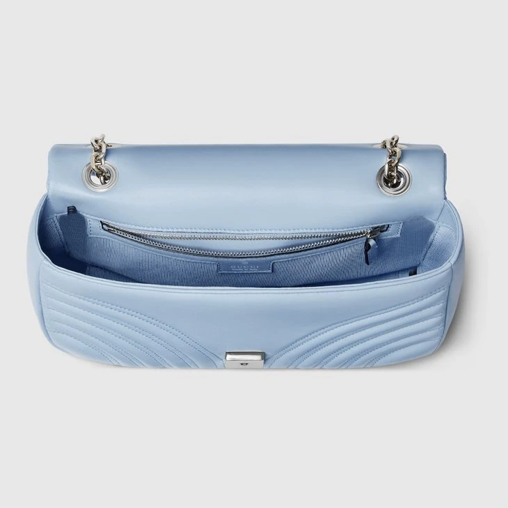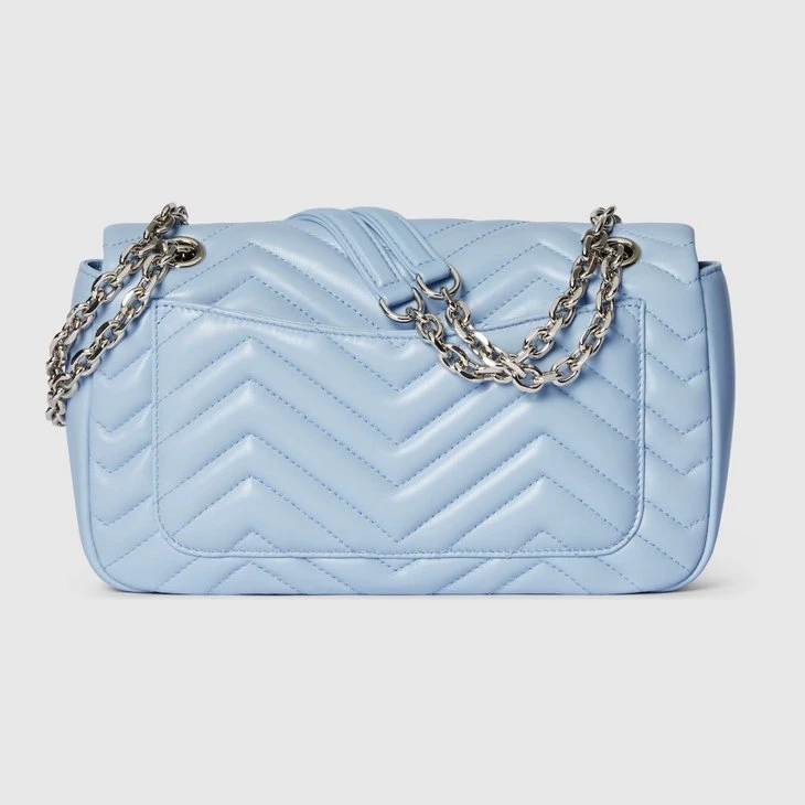 The GG Marmont, a signature collection of the House, features the Double G hardware, a faceted chain strap, and soft construction in an exceptionally supple leather. A sleek back pocket introduces a functional touch to the medium and large sizes.Light blue matelassé chevron lambskin leather