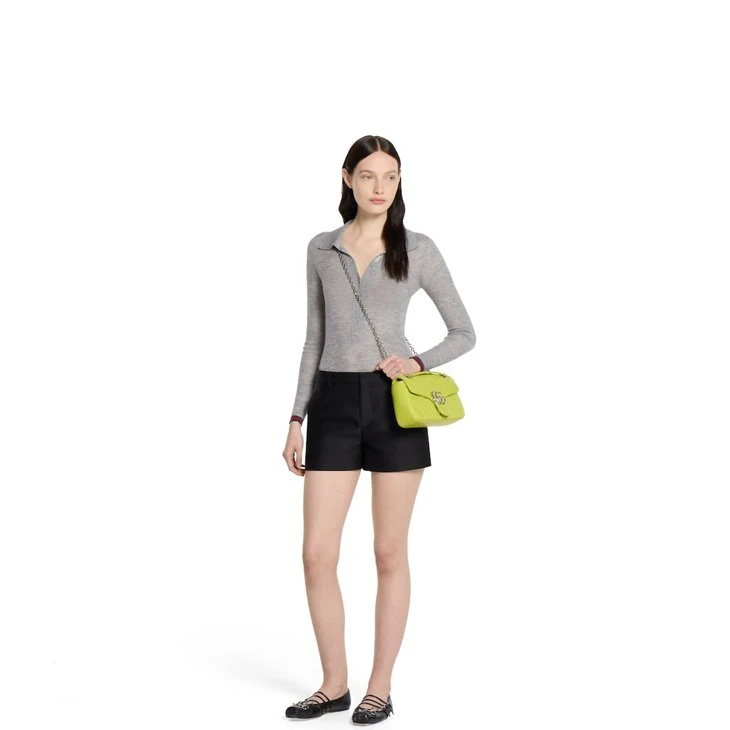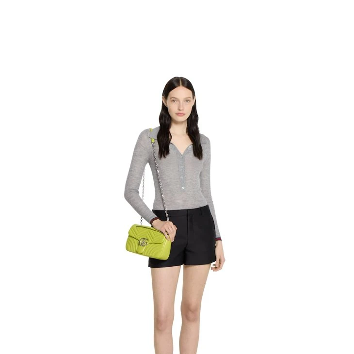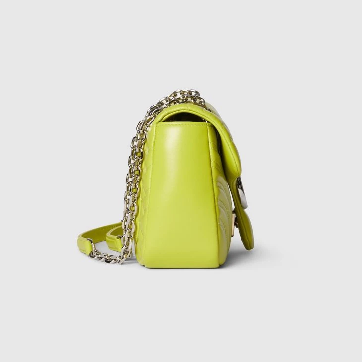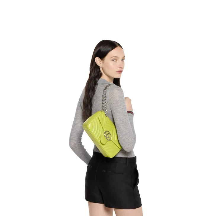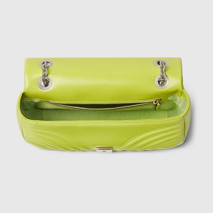 The GG Marmont, a signature collection of the House, features the Double G hardware, a faceted chain strap, and soft construction in an exceptionally supple leather. A sleek back pocket introduces a functional touch to the medium and large sizes.Bright green matelassé chevron lambskin leather