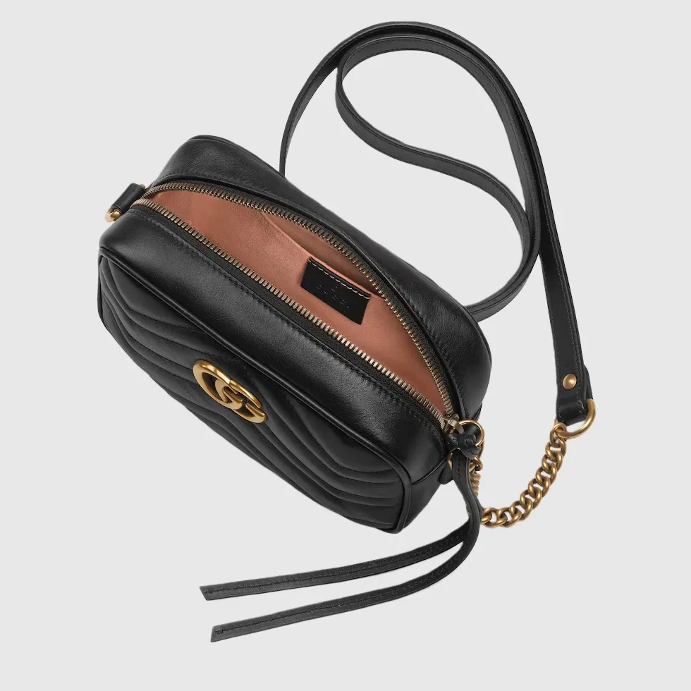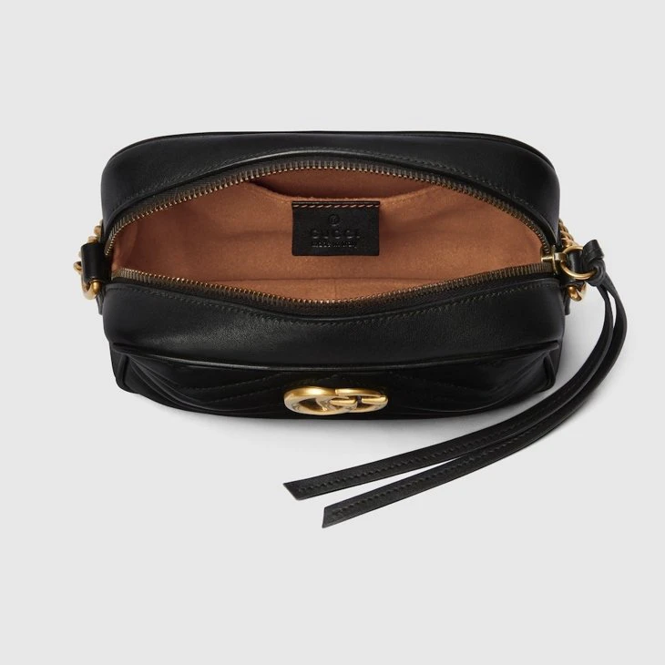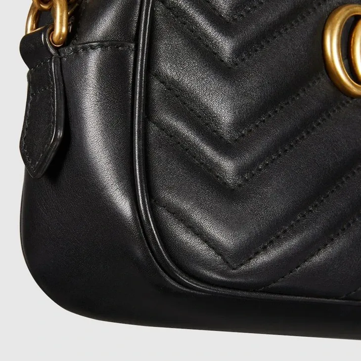 The mini GG Marmont chain shoulder bag has a softly structured shape and a zip top closure with Double G hardware. The chain shoulder strap has a leather shoulder detail. The camera bag is made in matelassé leather with a chevron design and GG on the back.Black matelassé chevron leather with GG on the back