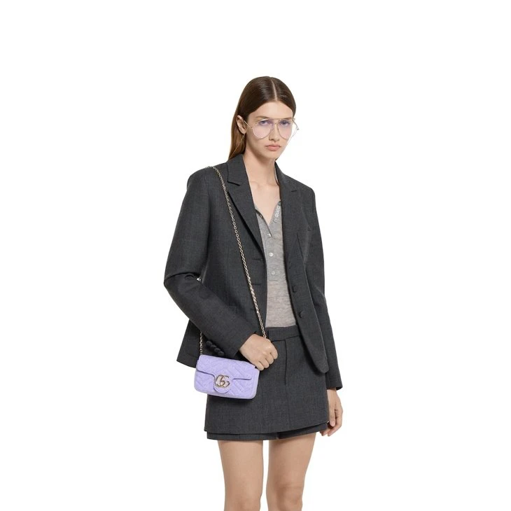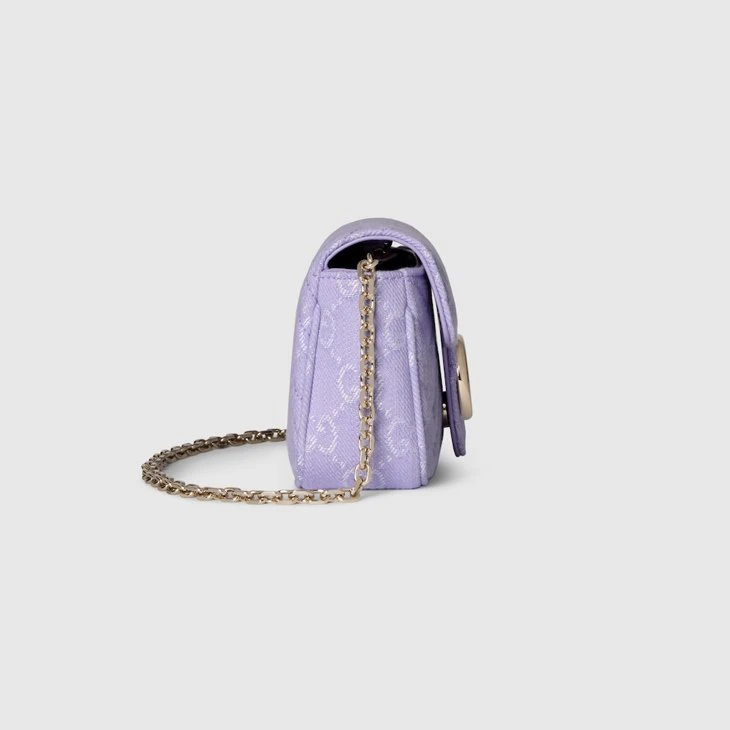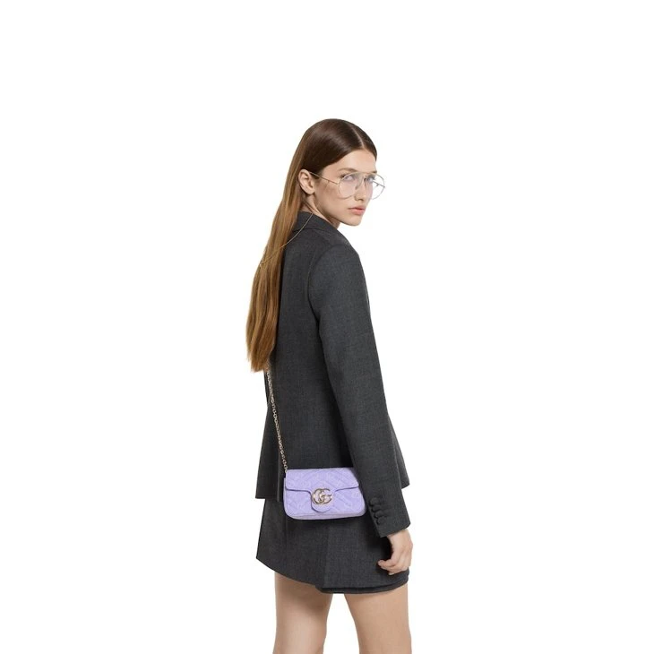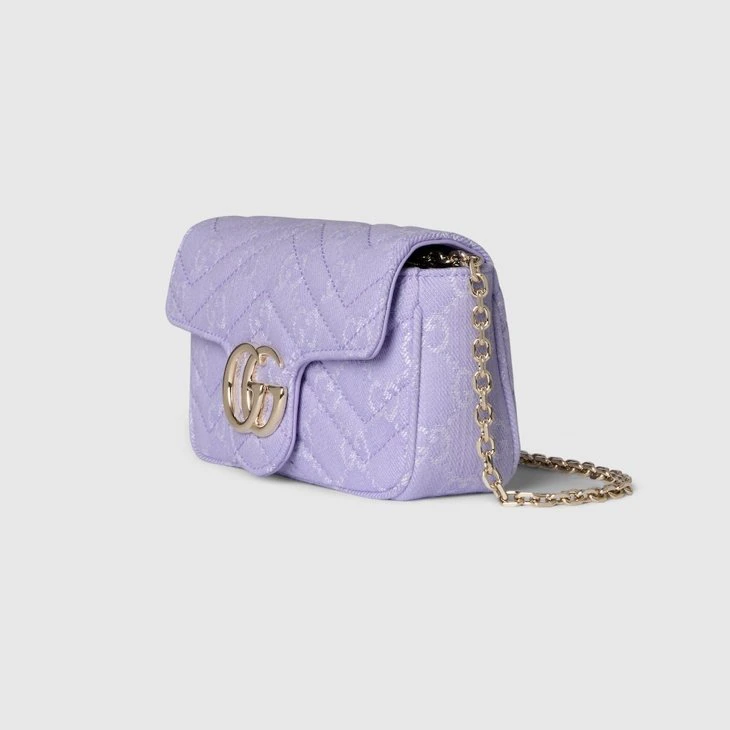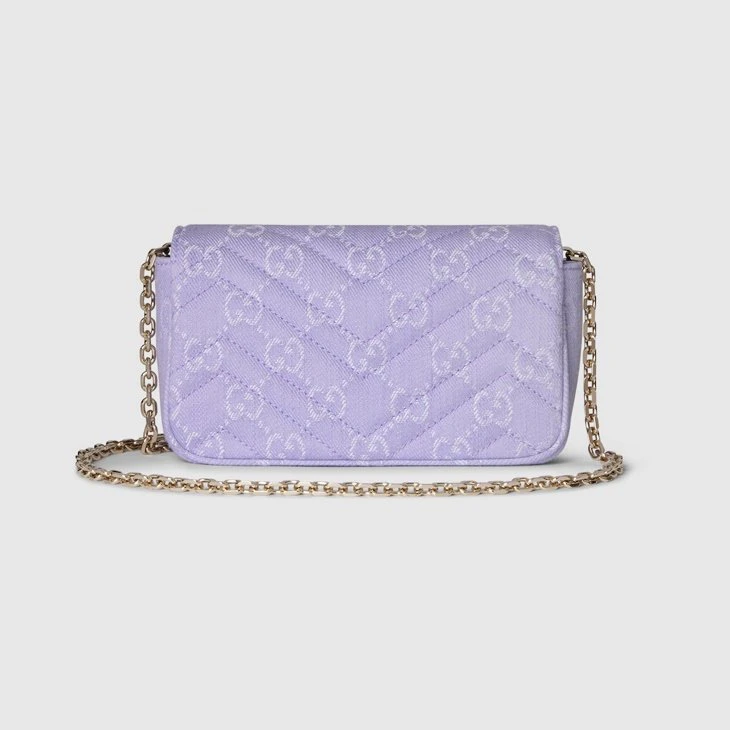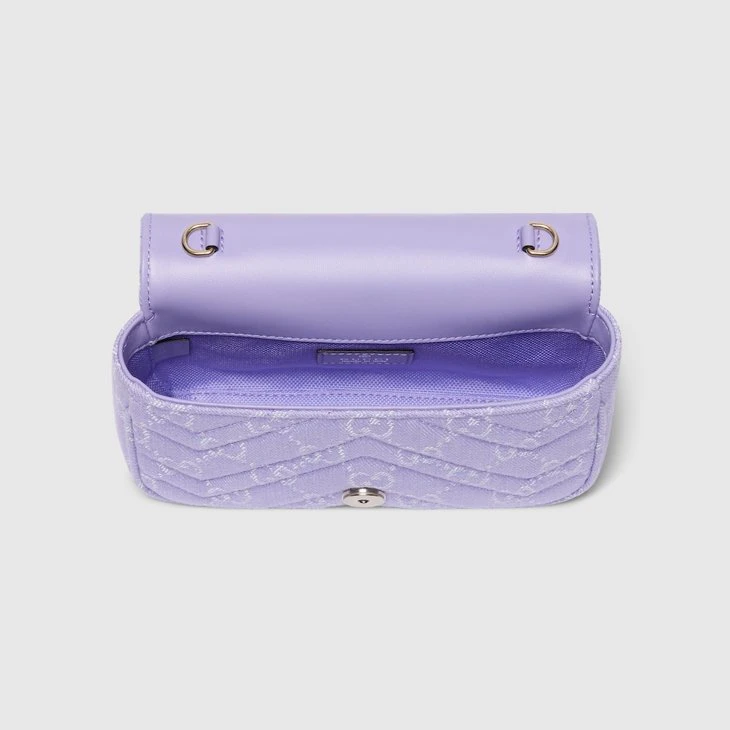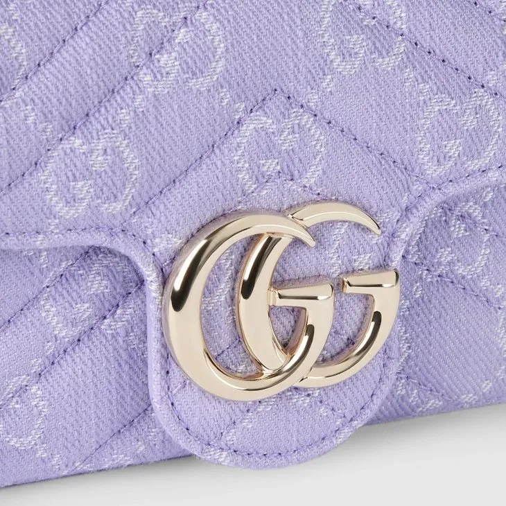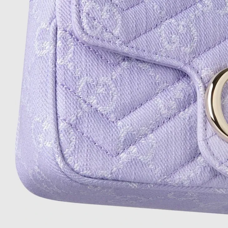 This GG Marmont shoulder bag is crafted from the refined matelassé chevron denim. The shape is defined by the line’s emblematic Double G hardware, an archival symbol from the 1970s that has become a hallmark of the House.Lilac and white matelassé chevron GG denim