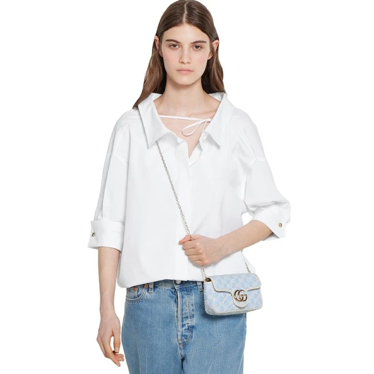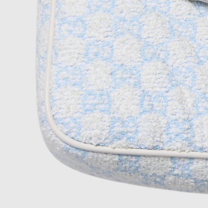 The GG Marmont, a signature collection of the House, features the Double G hardware, a faceted chain strap, and supple construction in refined materials. This style is crafted in GG bouclé in a fresh color for the season.Light blue and white GG bouclé