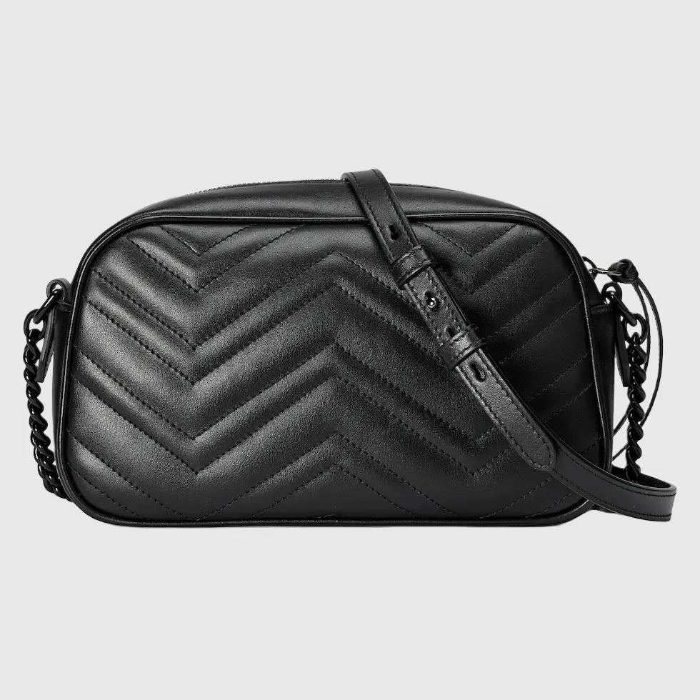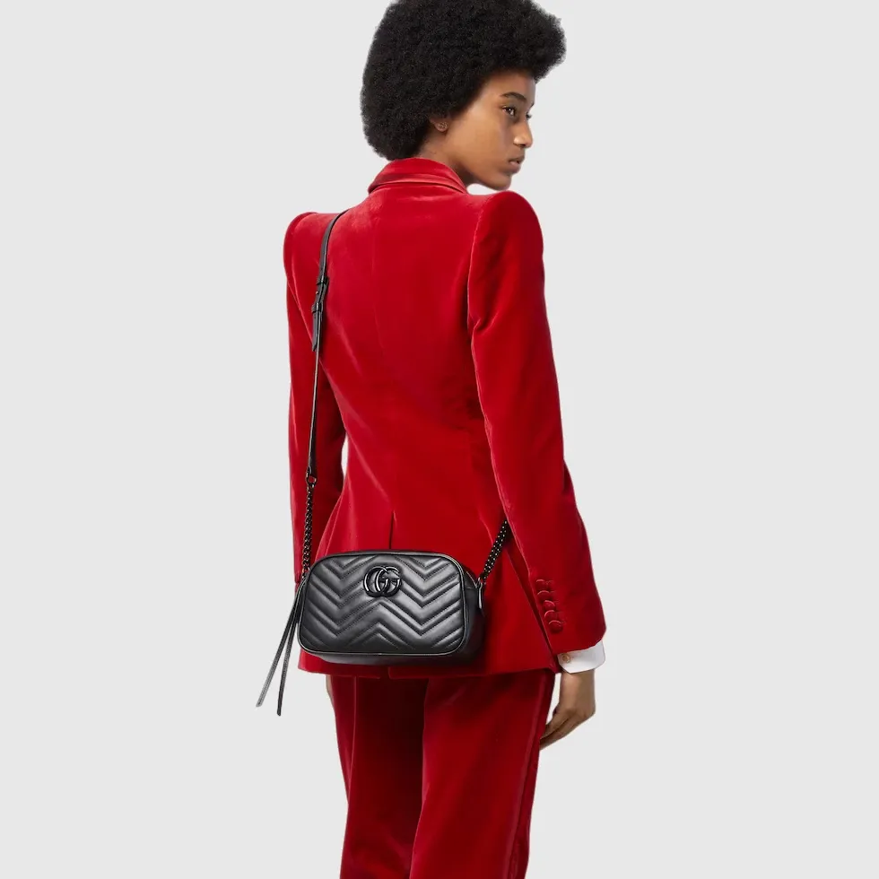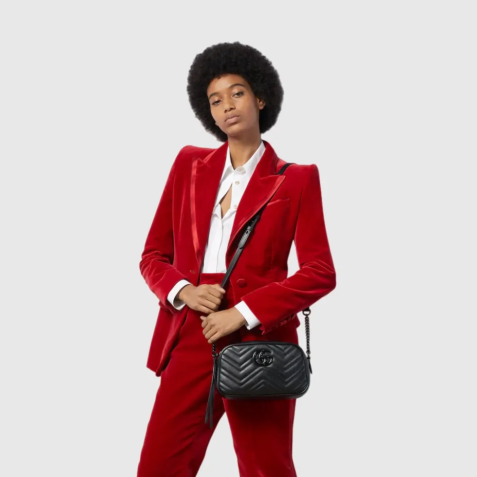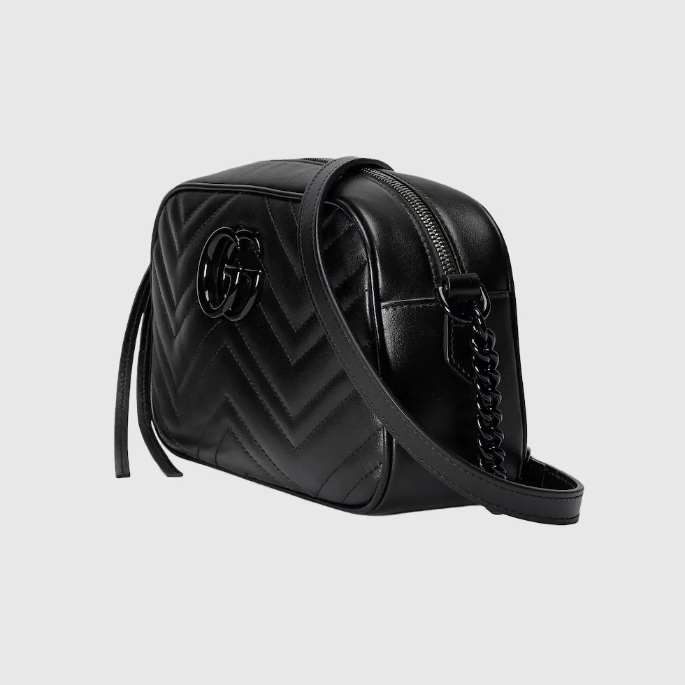 The GG Marmont small camera bag has a softly structured shape and a zip top closure with the Double G hardware. The chain shoulder strap has a leather shoulder detail. Made in matelassé leather with a chevron design. The emblematic accessory is introduced with tonal hardware for Gucci Love Parade.Black matelassé chevron leather