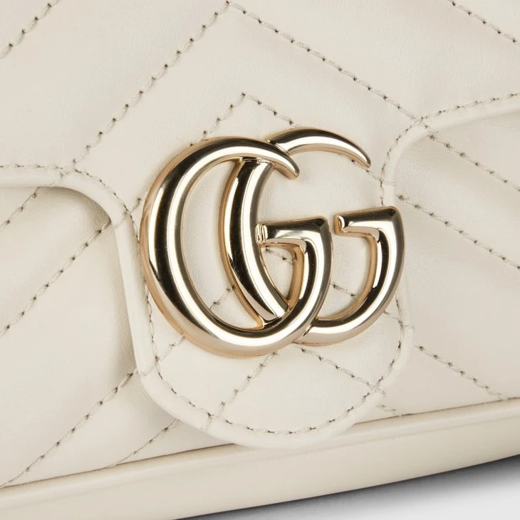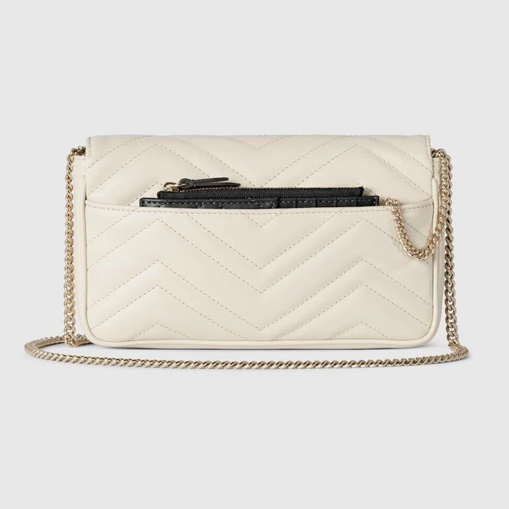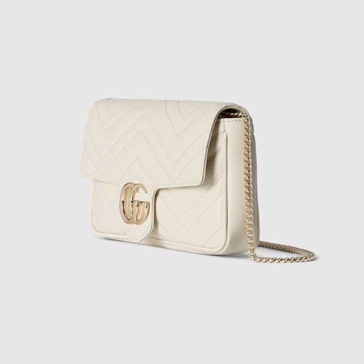 The Double G hardware brings the past into the House’s present with the notion that a cherished wardrobe is enriched by items that can be worn season after season. This bag with a chain strap is crafted from the signature matelassé chevron leather in white, while the inside features a contrasting black leather card case that can be detached.White matelassé chevron leather