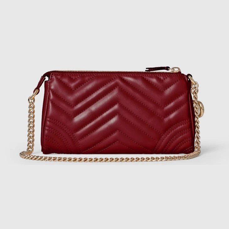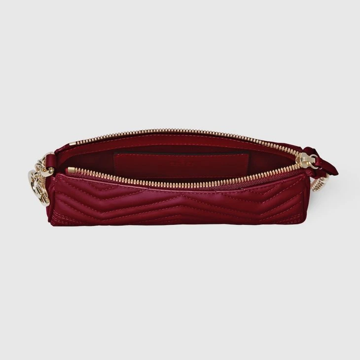 In the Fall Winter 2025 collection, part of the GG Marmont collection, this small shoulder bag features a soft, structured silhouette and the signature Double G as a zip puller. A faceted chain strap and gold-toned hardware complete the design, while a flat leather pocket define the interior.Gucci Rosso Ancora red matelassé chevron leather