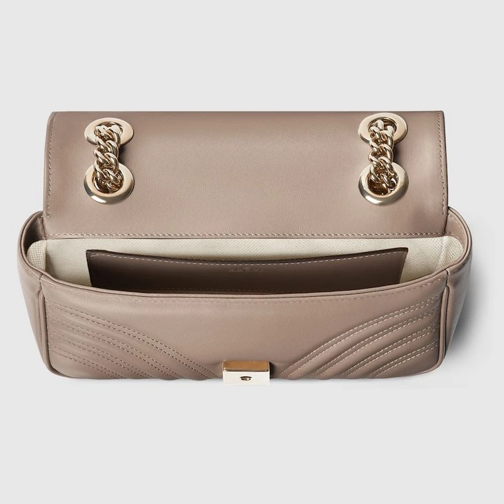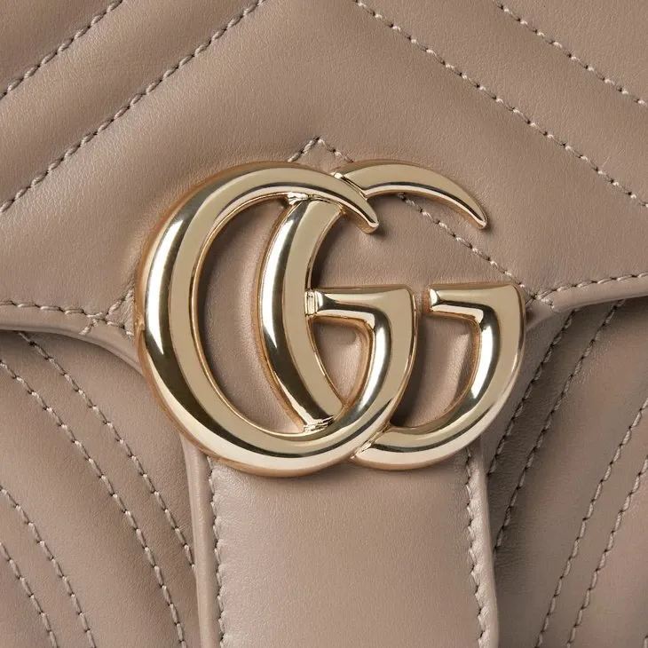 Embellished with the archival Double G logo, first introduced in the 1970s, the GG Marmont bag has established itself as a signature style of the House. The two capital letters of the style’s name refer to this emblem, recognizable by the partially overlapping hardware on the handbag’s front. Crafted from soft matelassé leather, the elegant handbag is evocative of Florentine craftsmanship.Taupe matelassé chevron leather