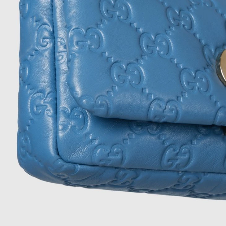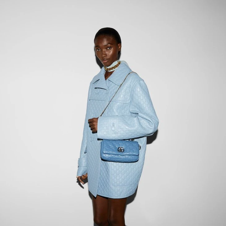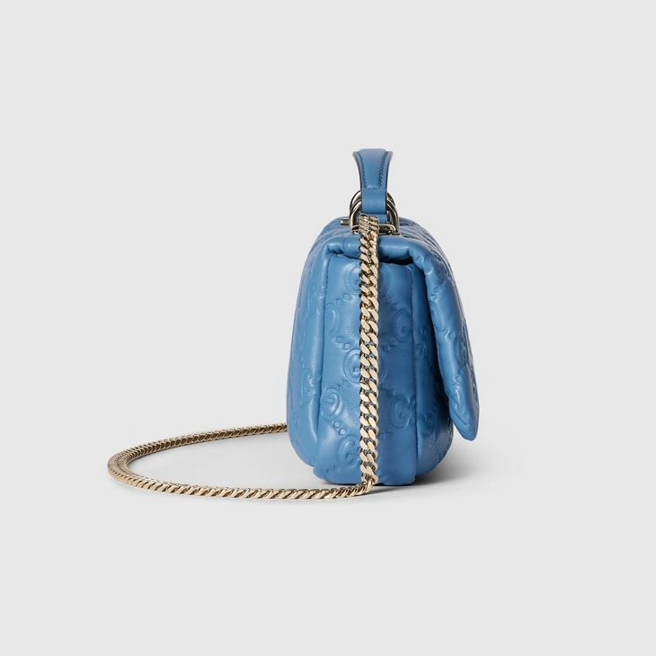 The GG Milano top handle bag debuted at the Fall Winter 2024 fashion show during Milan Fashion Week, paying tribute to the city which inspired the design. It features a new Double G hardware, and the puffy GG embossed leather has a soft and silky touch. The chain strap allows the bag to be worn crossybody or on the shoulder.Blue GG embossed puffy leather