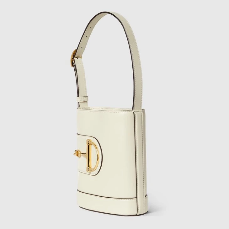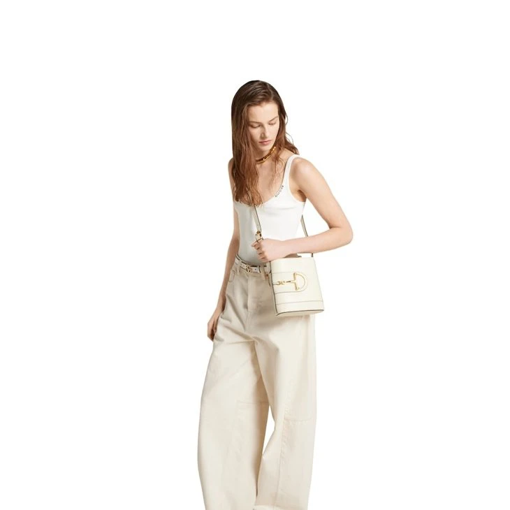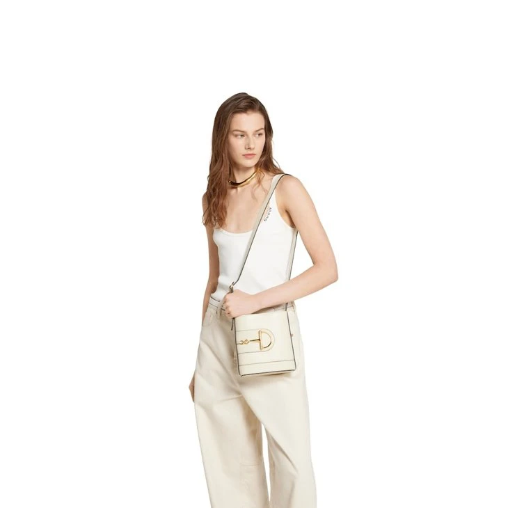 In the Spring Summer 2025 collection, the Gucci 73 is inspired by an archival bucket bag from its eponymous year. It features a contemporary take on the Horsebit hardware, and can be worn crossbody, over the shoulder or held as a handbag.White smooth leather