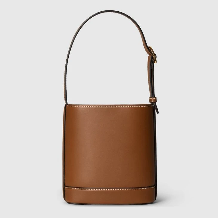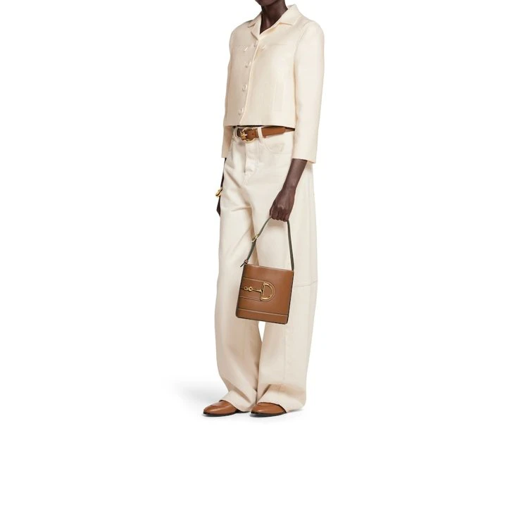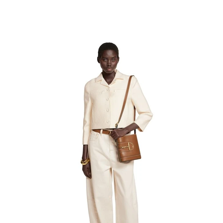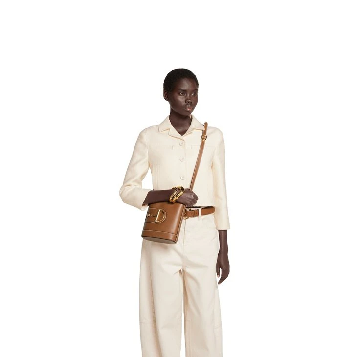 In the Spring Summer 2025 collection, the Gucci 73 is inspired by an archival bucket bag from its eponymous year. It features a contemporary take on the Horsebit hardware, and can be worn crossbody, over the shoulder or held as a handbag.Brown smooth leather