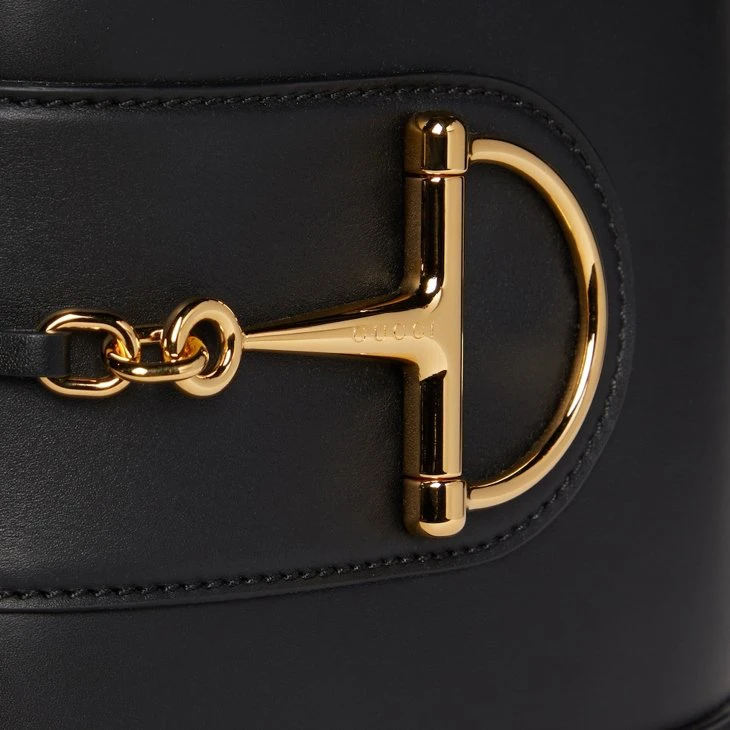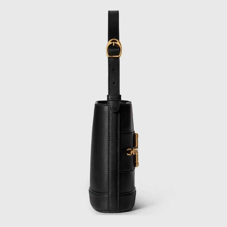 In the Spring Summer 2025 collection, the Gucci 73 is inspired by an archival bucket bag from its eponymous year. It features a contemporary take on the Horsebit hardware, and can be worn crossbody, over the shoulder or held as a handbag.Black smooth leather
