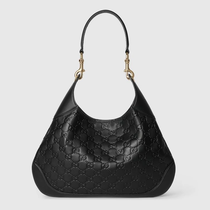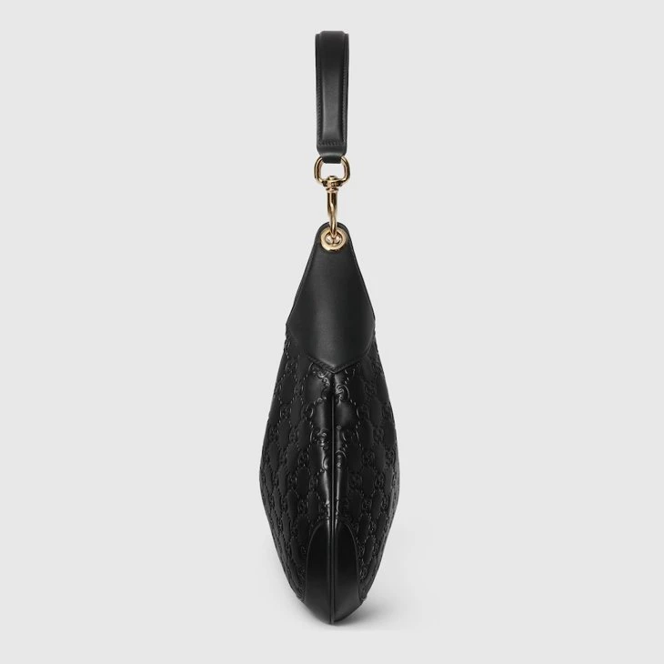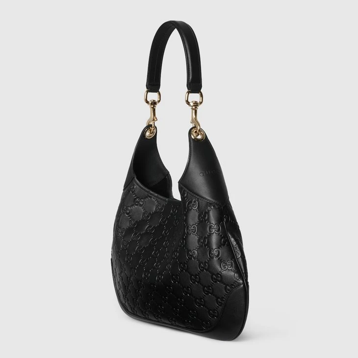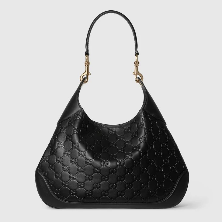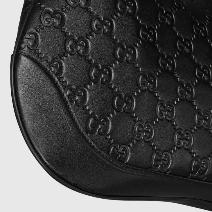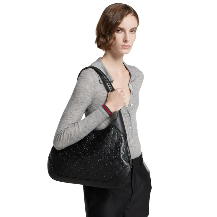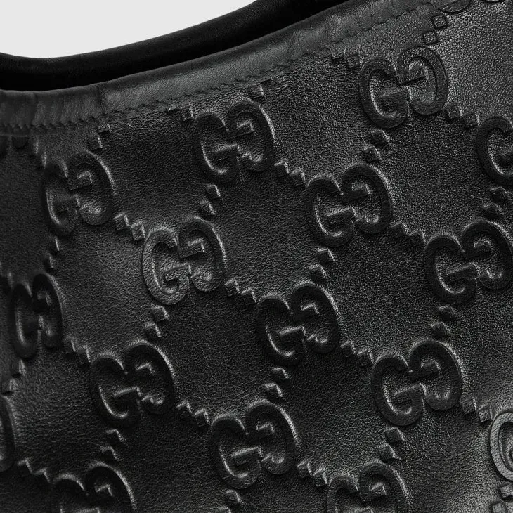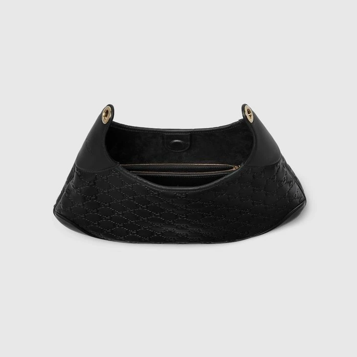 Introducing the Gucci B, which draws inspiration from a 1950s archival style. This shoulder bag, embodying the essence of its mid-20th century design origins, is crafted from GG embossed leather which drapes on the body.Black GG embossed leather