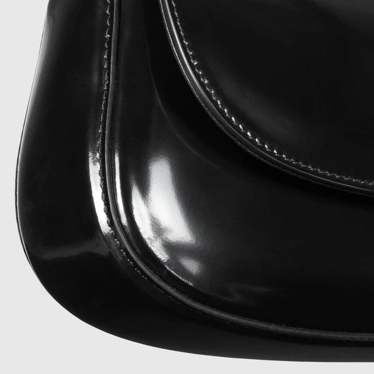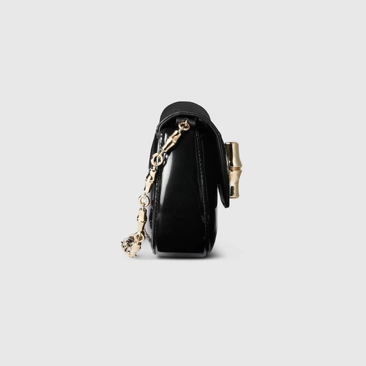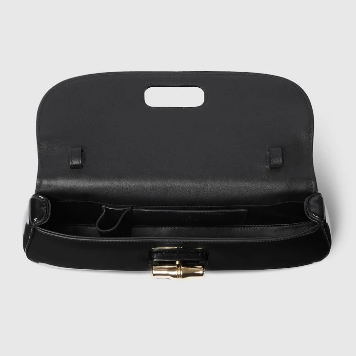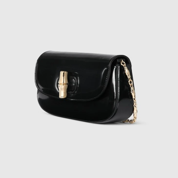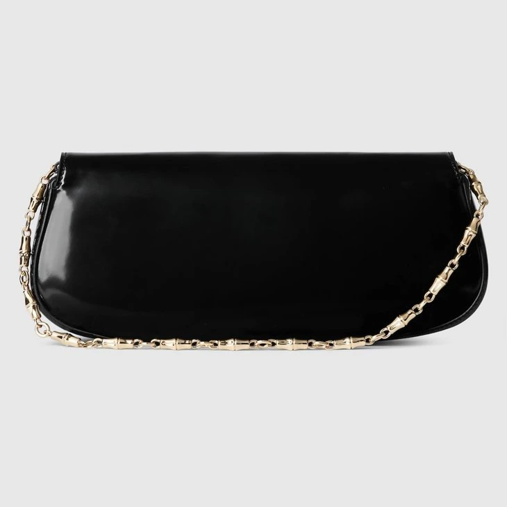 In the Spring Summer 2025 collection, this clutch reinterprets the House’s bamboo motif, and can be worn on the shoulder with its intricate chain strap or held as an evening clutch. Gucci Bamboo Night brings the beauty of evening to life.Black shiny, polished leather