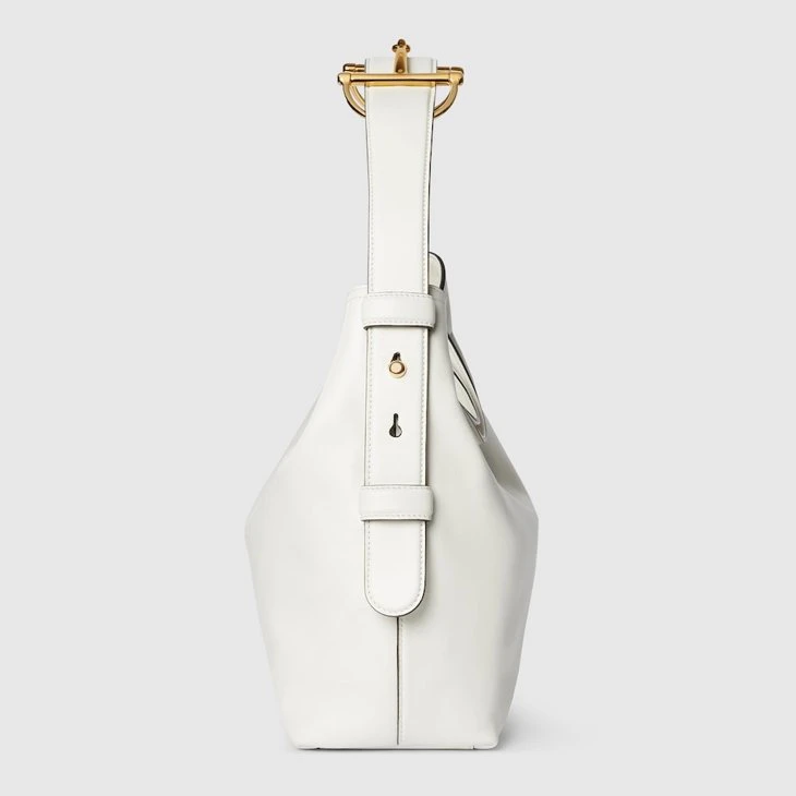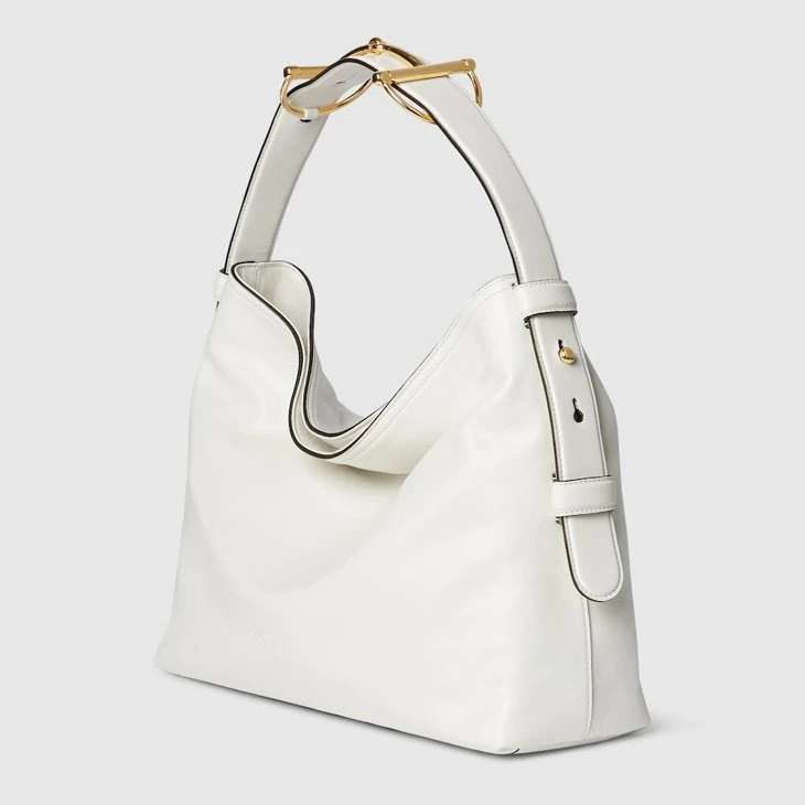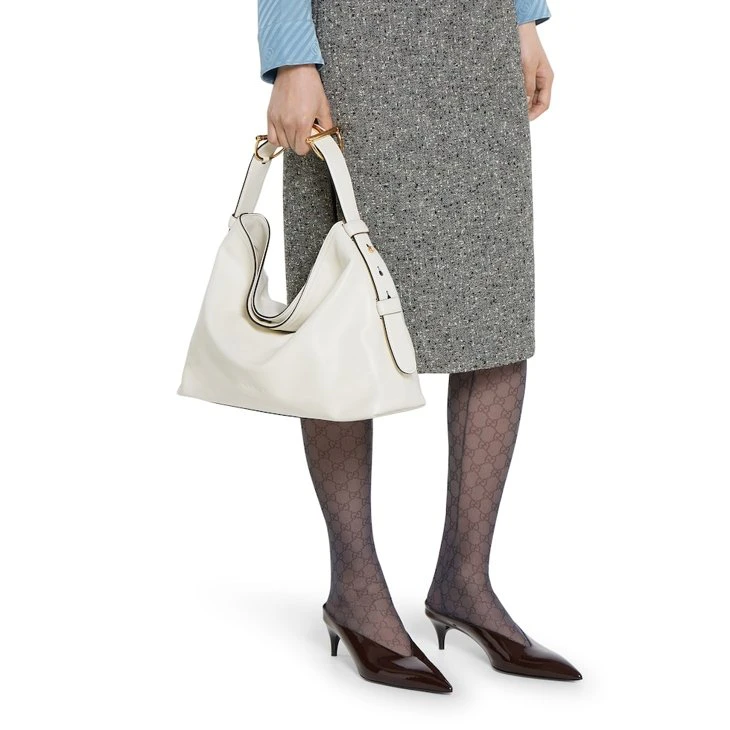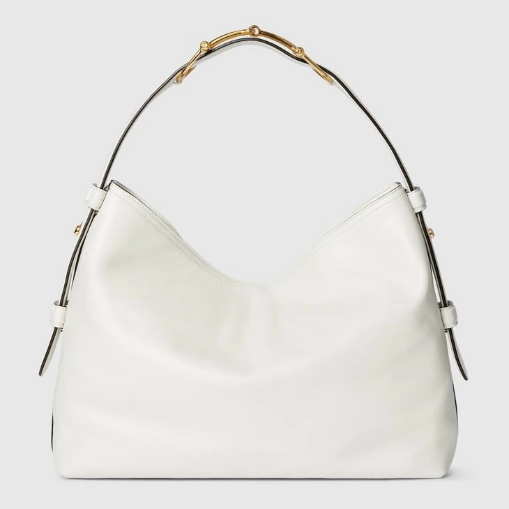 In the Fall Winter 2025 collection, the Gucci Beatrix handbag features a relaxed silhouette elevated by the signature Horsebit detail on the shoulder strap. The gold-toned hardware enhance its refined feel, while a zip pocket inside keeps essentials secure. Elegant yet functional, it’s designed to carry your everyday must-haves with ease.White soft smooth leather