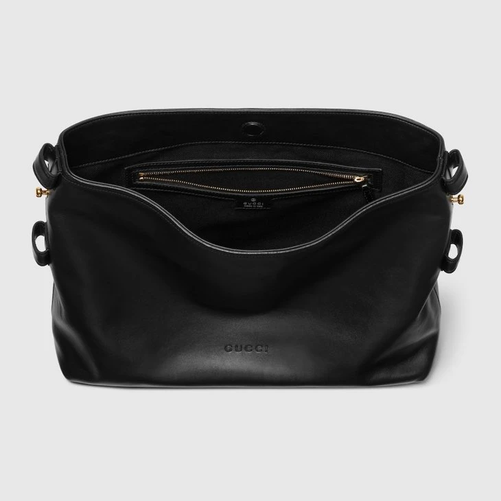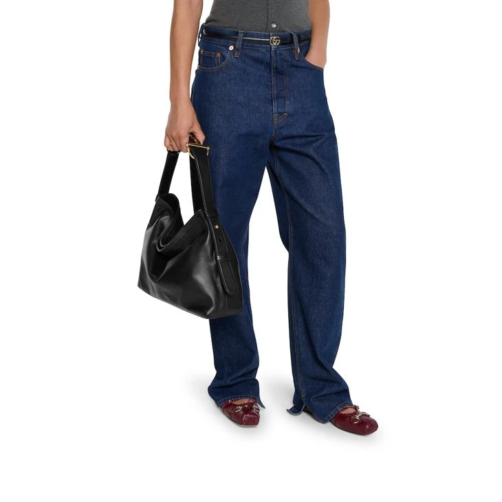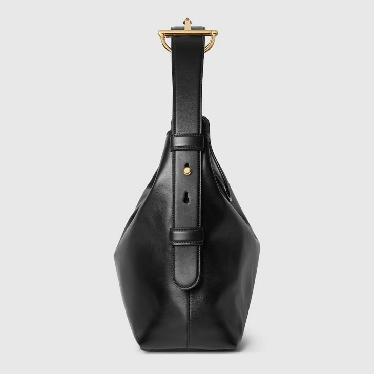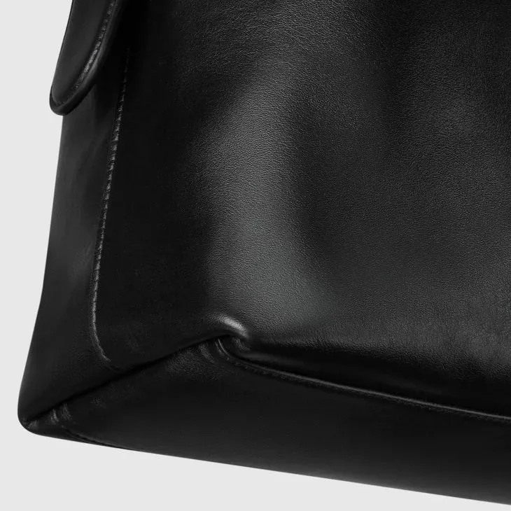 In the Fall Winter 2025 collection, the Gucci Beatrix handbag features a relaxed silhouette elevated by the signature Horsebit detail on the shoulder strap. The gold-toned hardware enhance its refined feel, while a zip pocket inside keeps essentials secure. Elegant yet functional, it’s designed to carry your everyday must-haves with ease.Black soft smooth leather