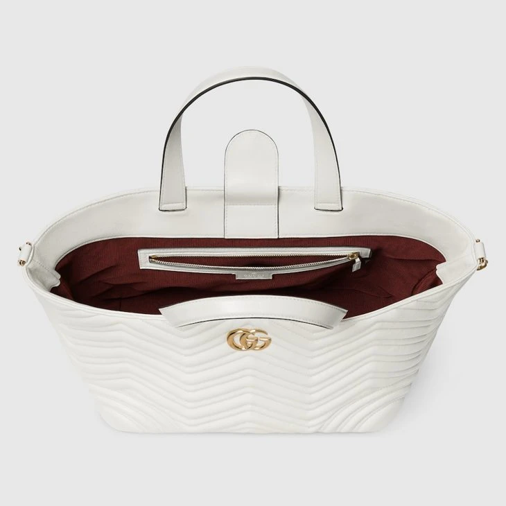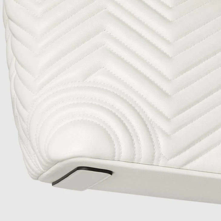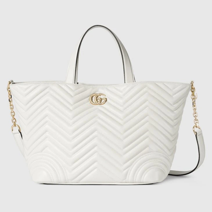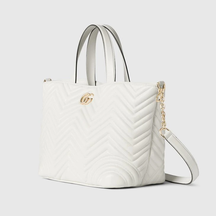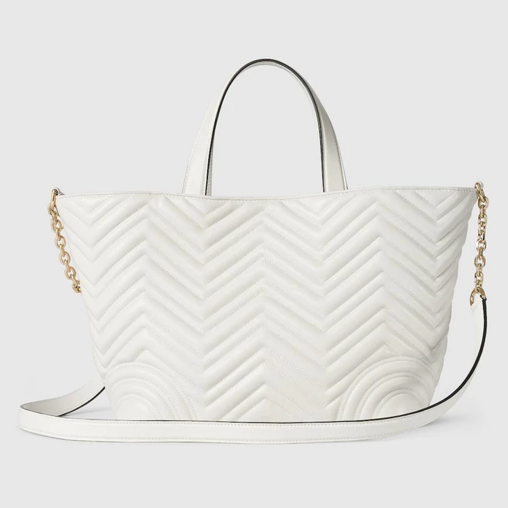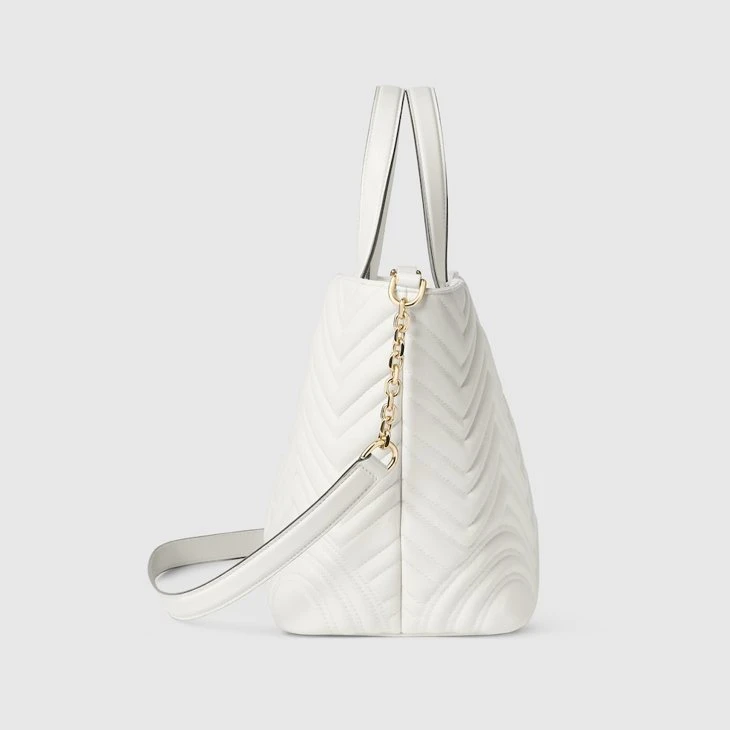 Gucci Betty adds a touch of spontaneity to refined design, which can change from a structured tote to soft-shaped bucket. The style is completed with top handles and a chain shoulder strap, offering versatile styling options.White matelassé chevron lambskin leather
