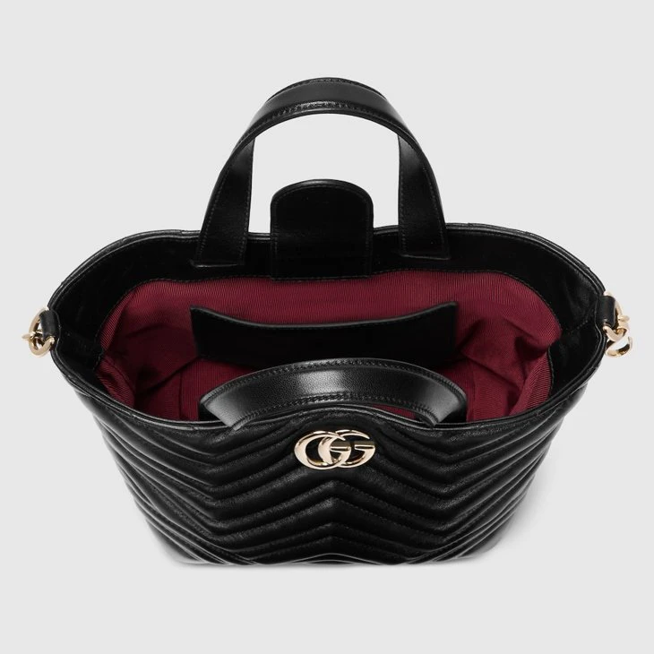 Gucci Betty adds a touch of spontaneity to refined design, which can change from a structured tote to soft-shaped bucket. The style is completed with top handles and a chain shoulder strap, offering versatile styling options.Black matelassé chevron lambskin leather