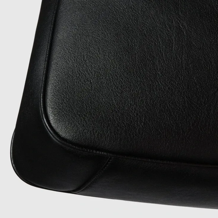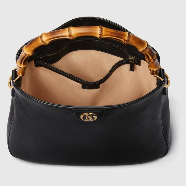 Combining recognizable elements of the House, the large-sized shoulder bag is defined by its bamboo handles and Double G hardware. Crafted from black leather, the accessory is further accentuated by a contrasting leather shoulder strap.Black leather